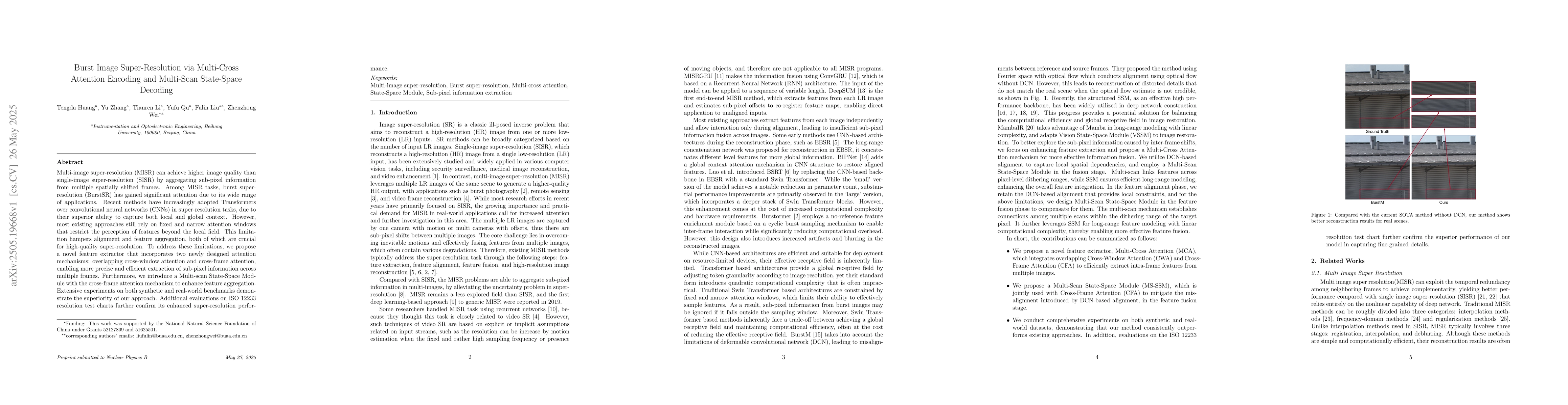 Multi-image super-resolution (MISR) can achieve higher image quality than single-image super-resolution (SISR) by aggregating sub-pixel information from multiple spatially shifted frames. Among MISR tasks, burst super-resolution (BurstSR) has gained significant attention due to its wide range of applications. Recent methods have increasingly adopted Transformers over convolutional neural networks (CNNs) in super-resolution tasks, due to their superior ability to capture both local and global context. However, most existing approaches still rely on fixed and narrow attention windows that restrict the perception of features beyond the local field. This limitation hampers alignment and feature aggregation, both of which are crucial for high-quality super-resolution. To address these limitations, we propose a novel feature extractor that incorporates two newly designed attention mechanisms: overlapping cross-window attention and cross-frame attention, enabling more precise and efficient extraction of sub-pixel information across multiple frames. Furthermore, we introduce a Multi-scan State-Space Module with the cross-frame attention mechanism to enhance feature aggregation. Extensive experiments on both synthetic and real-world benchmarks demonstrate the superiority of our approach. Additional evaluations on ISO 12233 resolution test charts further confirm its enhanced super-resolution performance.