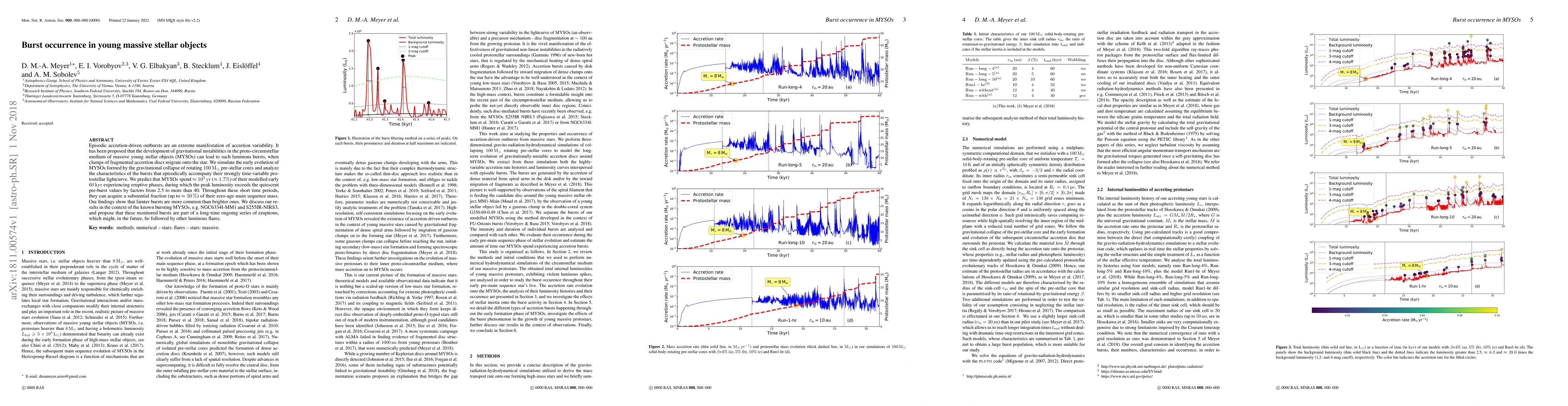 This paper investigates episodic accretion-driven outbursts in young massive stellar objects (MYSOs) due to gravitational instabilities in their proto-circumstellar medium. The study finds that MYSOs experience eruptive phases for ~1.7% of their early evolution, during which their luminosity can increase by factors up to 40, potentially acquiring up to 50% of their future mass.
