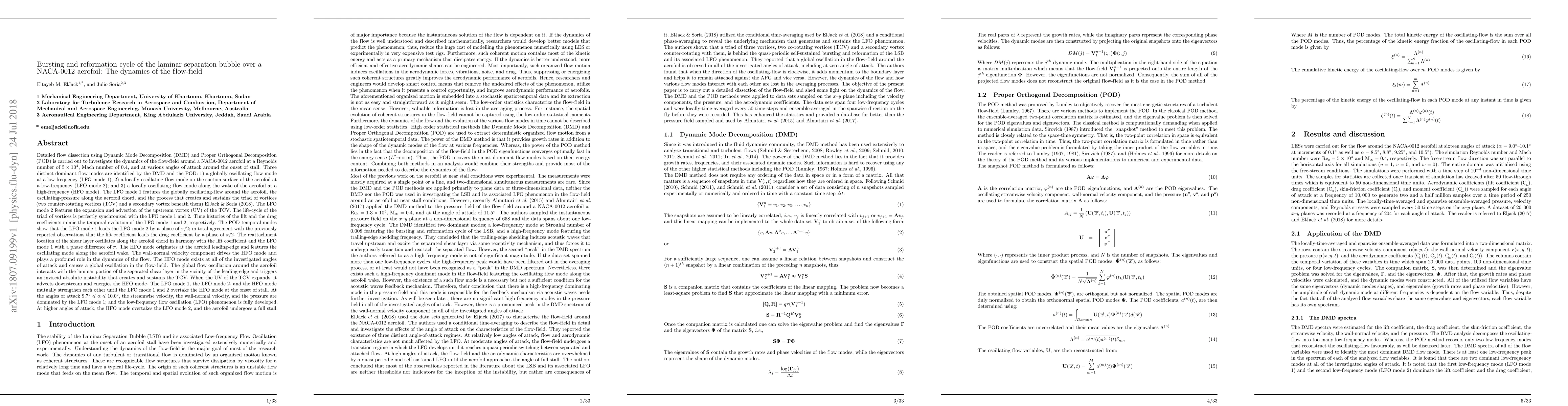 Detailed flow dissection using Dynamic Mode Decomposition (DMD) and Proper Orthogonal Decomposition (POD) is carried out to investigate the dynamics of the flow-field around a NACA-0012 aerofoil at a Reynolds number of $5\times 10^4$, Mach number of $0.4$, and at various angles of attack around the onset of stall. Three distinct dominant flow modes are identified by the DMD and the POD: 1) a globally oscillating flow mode at a low-frequency (LFO mode 1); 2) a locally oscillating flow mode on the suction surface of the aerofoil at a low-frequency (LFO mode 2); and 3) a locally oscillating flow mode along the wake of the aerofoil at a high-frequency (HFO mode). The LFO mode 1 features the globally oscillating-flow around the aerofoil, the oscillating-pressure along the aerofoil chord, and the process that creates and sustains the triad of vortices. The LFO mode 2 features the expansion and advection of the upstream vortex (UV) of the TCV. The HFO mode originates at the aerofoil leading-edge and features the oscillating mode along the aerofoil wake. The HFO mode exists at all of the investigated angles of attack and causes a global oscillation in the flow-field. The global flow oscillation around the aerofoil interacts with the laminar portion of the separated shear layer in the vicinity of the leading-edge and triggers an inviscid absolute instability that creates and sustains the TCV. When the UV of the TCV expands, it advects downstream and energies the HFO mode. The LFO mode 1, the LFO mode 2, and the HFO mode mutually strengthen each other until the LFO mode 1 and 2 overtake the HFO mode at the onset of stall. At the angles of attack $9.7^{\circ} \leq \alpha \leq 10.0^{\circ}$ the low-frequency flow oscillation (LFO) phenomenon is fully developed. At higher angles of attack, the HFO mode overtakes the LFO mode 2, and the aerofoil undergoes a full stall.