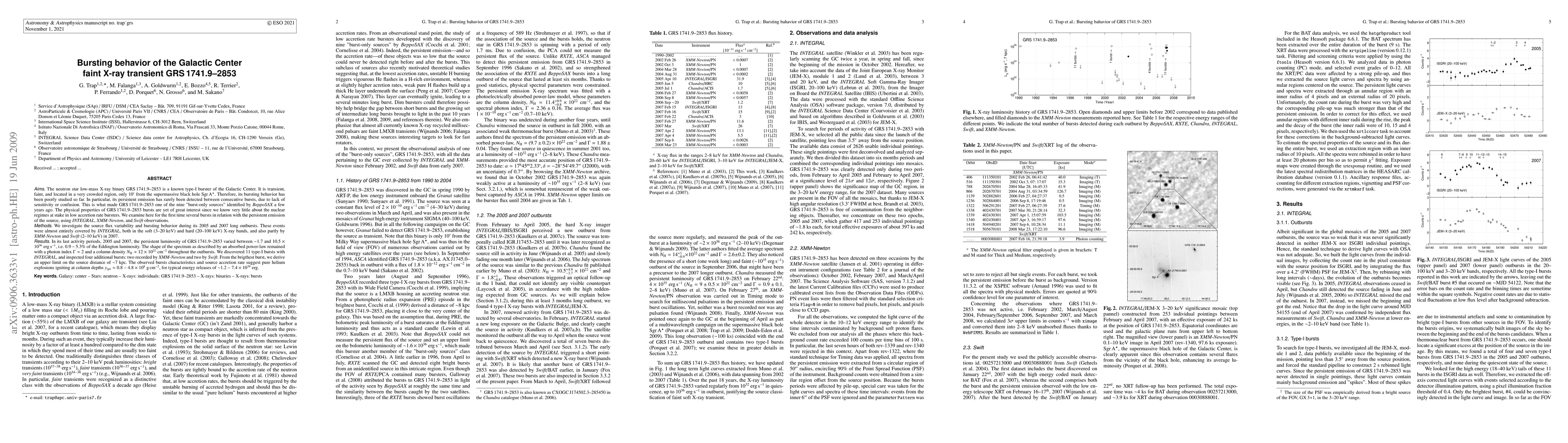 The neutron star low-mass X-ray binary GRS 1741.9-2853 is a known type-I burster of the Galactic Center. It is transient, faint, and located in a very crowded region, only 10 arcmin from the supermassive black hole Sgr A*. Therefore, its bursting behavior has been poorly studied so far. In particular, its persistent emission has rarely been detected between consecutive bursts, due to lack of sensitivity or confusion. This is what made GRS 1741.9-2853 one of the nine "burst-only sources" identified by BeppoSAX a few years ago. The physical properties of GRS 1741.9-2853 bursts are yet of great interest since we know very little about the nuclear regimes at stake in low accretion rate bursters. We examine here for the first time several bursts in relation with the persistent emission of the source, using INTEGRAL, XMM-Newton, and Swift observations. We investigate the source flux variability and bursting behavior during its 2005 and 2007 long outbursts. The persistent luminosity of GRS 1741.9-2853 varied between ~1.7 and 10.5 10^36 erg s^-1, i.e. 0.9-5.3% of the Eddington luminosity. The shape of the spectrum as described by an absorbed power-law remained with a photon index Gamma ~ 2 and a column density $N_{\rm H} ~ 12 10^22 cm^-2 throughout the outbursts. We discovered 11 type-I bursts with INTEGRAL, and inspected 4 additional bursts: 2 recorded by XMM-Newton and 2 by Swift. From the brigthest burst, we derive an upper limit on the source distance of ~7 kpc. The observed bursts characteristics and source accretion rate suggest pure helium explosions igniting at column depths y_{ign} ~ 0.8-4.8 10^8 g cm^-1, for typical energy releases of ~1.2-7.4 10^39 erg.