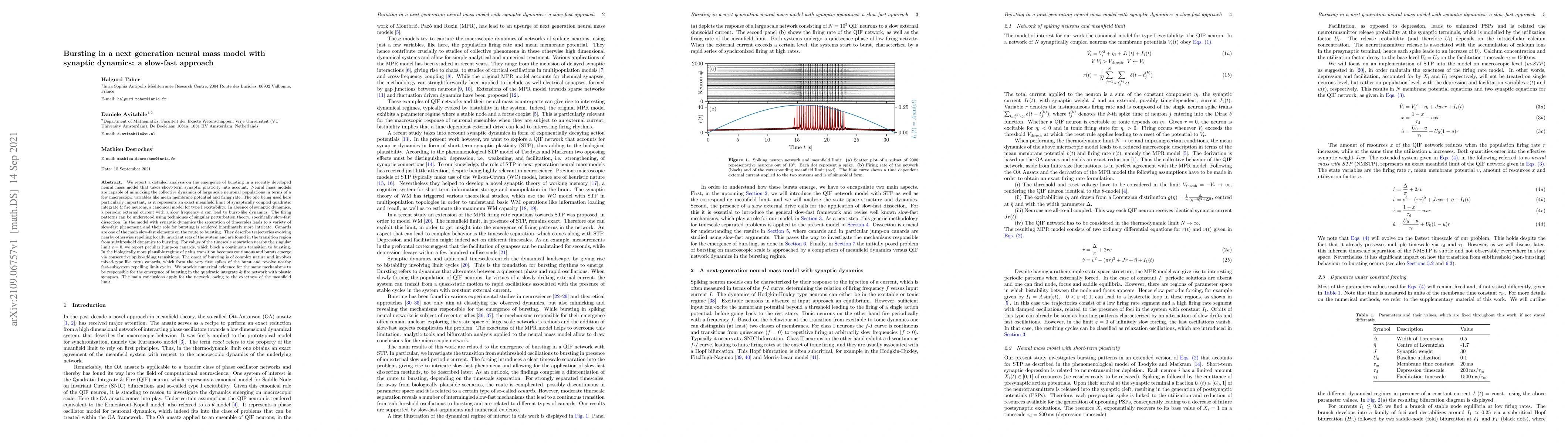 We report a detailed analysis on the emergence of bursting in a recently developed neural mass model that takes short-term synaptic plasticity into account. The one being used here is particularly important, as it represents an exact meanfield limit of synaptically coupled quadratic integrate & fire neurons, a canonical model for type I excitability. In absence of synaptic dynamics, a periodic external current with a slow frequency {\epsilon} can lead to burst-like dynamics. The firing patterns can be understood using techniques of singular perturbation theory, specifically slow-fast dissection. In the model with synaptic dynamics the separation of timescales leads to a variety of slow-fast phenomena and their role for bursting is rendered inordinately more intricate. Canards are one of the main slow-fast elements on the route to bursting. They describe trajectories evolving nearby otherwise repelling locally invariant sets of the system and are found in the transition region from subthreshold dynamics to bursting. For values of the timescale separation nearby the singular limit {\epsilon} = 0, we report peculiar jump-on canards, which block a continuous transition to bursting. In the biologically more plausible regime of {\epsilon} this transition becomes continuous and bursts emerge via consecutive spike-adding transitions. The onset of bursting is of complex nature and involves mixed-type like torus canards, which form the very first spikes of the burst and revolve nearby fast-subsystem repelling limit cycles. We provide numerical evidence for the same mechanisms to be responsible for the emergence of bursting in the quadratic integrate & fire network with plastic synapses. The main conclusions apply for the network, owing to the exactness of the meanfield limit.