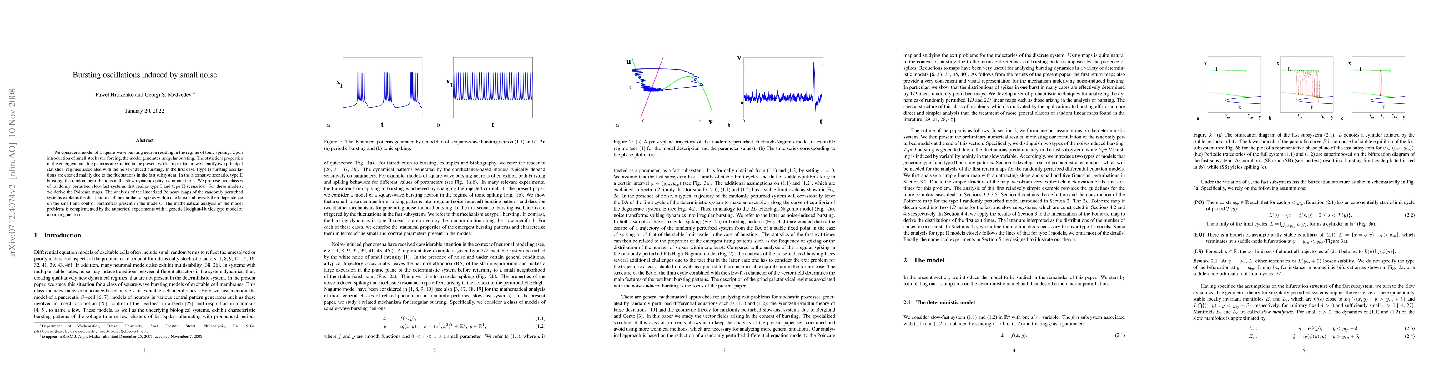 We consider a model of a square-wave bursting neuron residing in the regime of tonic spiking. Upon introduction of small stochastic forcing, the model generates irregular bursting. The statistical properties of the emergent bursting patterns are studied in the present work. In particular, we identify two principal statistical regimes associated with the noise-induced bursting. In the first case, (type I) bursting oscillations are created mainly due to the fluctuations in the fast subsystem. In the alternative scenario, type II bursting, the random perturbations in the slow dynamics play a dominant role. We propose two classes of randomly perturbed slow-fast systems that realize type I and type II scenarios. For these models, we derive the Poincare maps. The analysis of the linearized Poincare maps of the randomly perturbed systems explains the distributions of the number of spikes within one burst and reveals their dependence on the small and control parameters present in the models. The mathematical analysis of the model problems is complemented by the numerical experiments with a generic Hodgkin-Huxley type model of a bursting neuron.