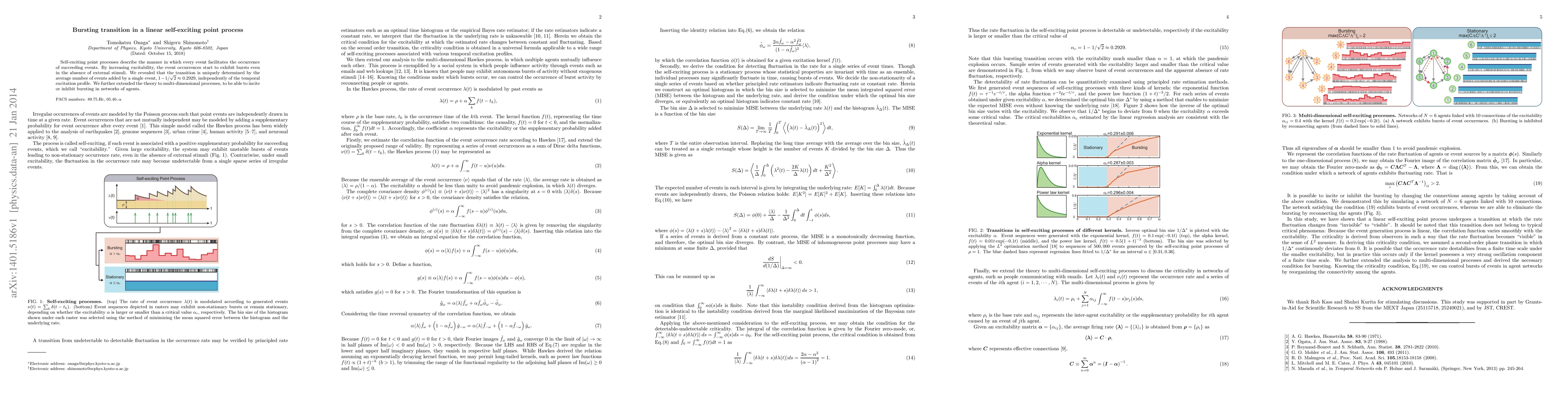 This paper investigates the bursting transition in linear self-exciting point processes, identifying that the transition is determined by the average number of events added by a single event, approximately 0.2929, regardless of the temporal excitation profile. The theory is also extended to multi-dimensional processes to manage bursting in networked systems.