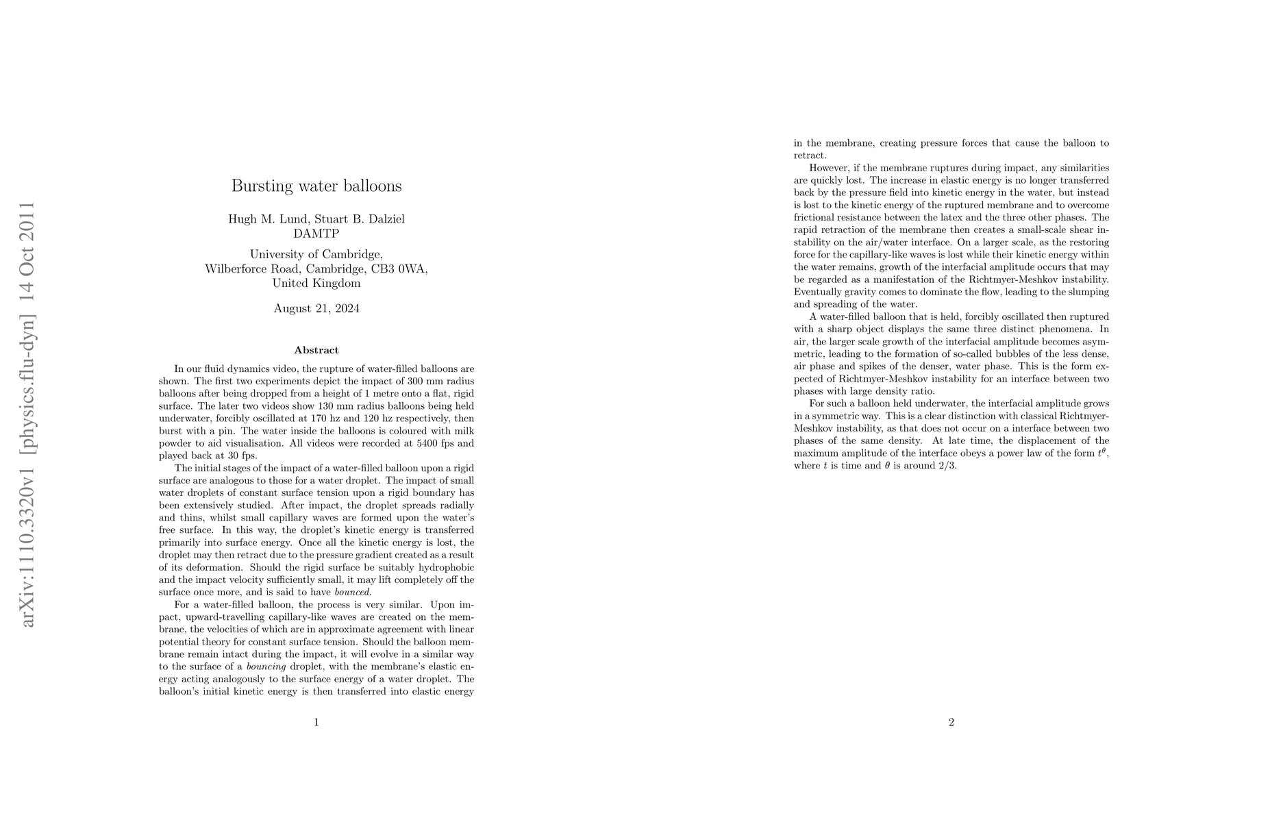 The impact and rupture of water-filled balloons upon a flat, rigid surface is studied experimentally, for which three distinct stages of the flow are observed. Due to the impact, waves are formed on the balloon's surface for which the restoring force is tension in the latex. Immediately following rupture of the membrane, a shear instability created by the retraction of the balloon is observed. At later times, a larger-scale growth of the interfacial amplitude is observed, that may be regarded as a manifestation of a phenomenon known as the Richtmyer-Meshkov instability. This flow is closely related to the classical understanding of the Richtmyer-Meshkov instability for when there exists a density difference between the fluids inside and outside the balloon. Further, it is shown experimentally that this growth of the interface may also occur when there is no density difference across the balloon, a situation that does not arise for the standard Richtmyer-Meshkov instability.
