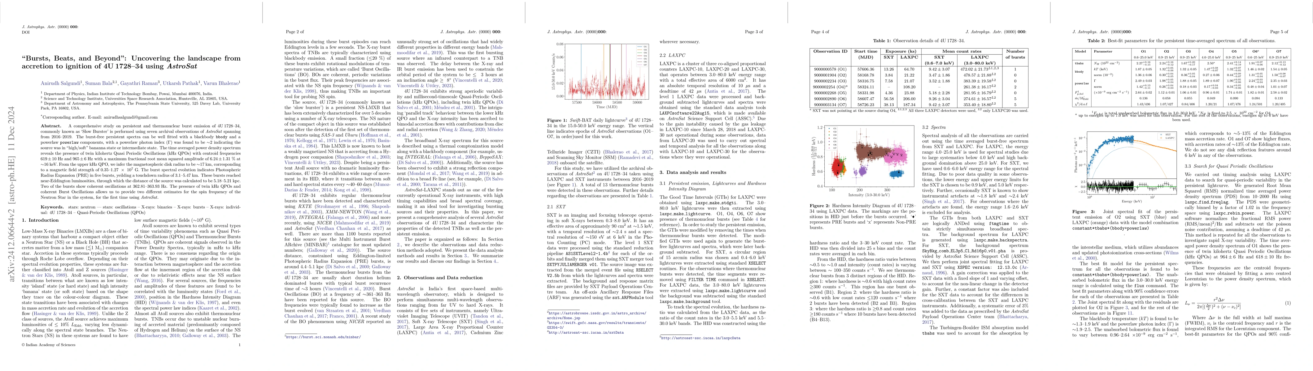This study uses seven \textit{AstroSat} observations of 4U 1728--34 to examine persistent and burst emissions, revealing a high/soft state and twin kHz QPOs. Burst spectral evolution shows Photospheric Radius Expansion and coherent oscillations, providing estimates for the neutron star's spin frequency and the source's distance at 5.18--5.21 kpc.