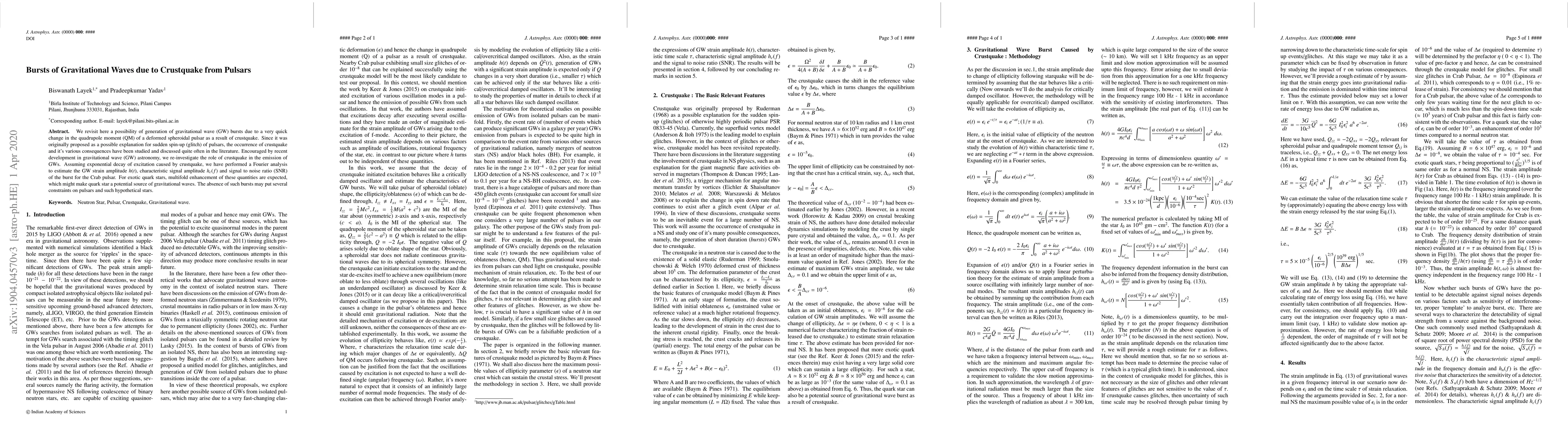 We explore here a possible consequence of crustquake, namely, the generation of bursts of gravitational waves (GWs) due to a sudden change in the quadrupole moment (QM) of a deformed pulsar as a result of crustquake. The occurrence of crustquake in a rotating neutron star can play many important roles in neutron star (NS) dynamics. Here we propose that if a pulsar undergoes crustquake, then the generation of bursts of GWs is an inevitable consequence of crustquake. We have estimated the strain amplitudes ($h_0$) for such bursts of GWs and compared with the strain amplitudes for GWs produced in various other scenarios for isolated pulsars as suggested earlier in the literature. The values we obtain are comparable to those suggestions. We also estimate the order of magnitude for characteristic strain ($h_c$) and signal to noise ratio (SNR) for such bursts. For exotic quarks stars, a multifold enhancement of strain amplitudes is expected, which makes quark stars a potential source of gravitational waves as a result of crustquake. The absence of such waves may put constraints on such hypothetical stars