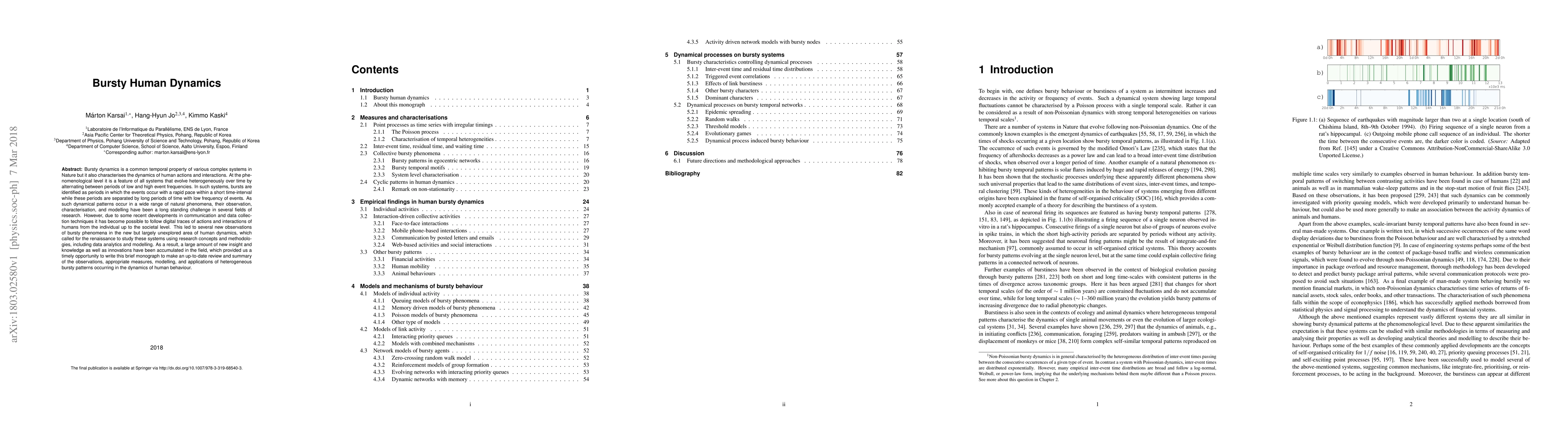 Bursty dynamics is a common temporal property of various complex systems in Nature but it also characterises the dynamics of human actions and interactions. At the phenomenological level it is a feature of all systems that evolve heterogeneously over time by alternating between periods of low and high event frequencies. In such systems, bursts are identified as periods in which the events occur with a rapid pace within a short time-interval while these periods are separated by long periods of time with low frequency of events. As such dynamical patterns occur in a wide range of natural phenomena, their observation, characterisation, and modelling have been a long standing challenge in several fields of research. However, due to some recent developments in communication and data collection techniques it has become possible to follow digital traces of actions and interactions of humans from the individual up to the societal level. This led to several new observations of bursty phenomena in the new but largely unexplored area of human dynamics, which called for the renaissance to study these systems using research concepts and methodologies, including data analytics and modelling. As a result, a large amount of new insight and knowledge as well as innovations have been accumulated in the field, which provided us a timely opportunity to write this brief monograph to make an up-to-date review and summary of the observations, appropriate measures, modelling, and applications of heterogeneous bursty patterns occurring in the dynamics of human behaviour.