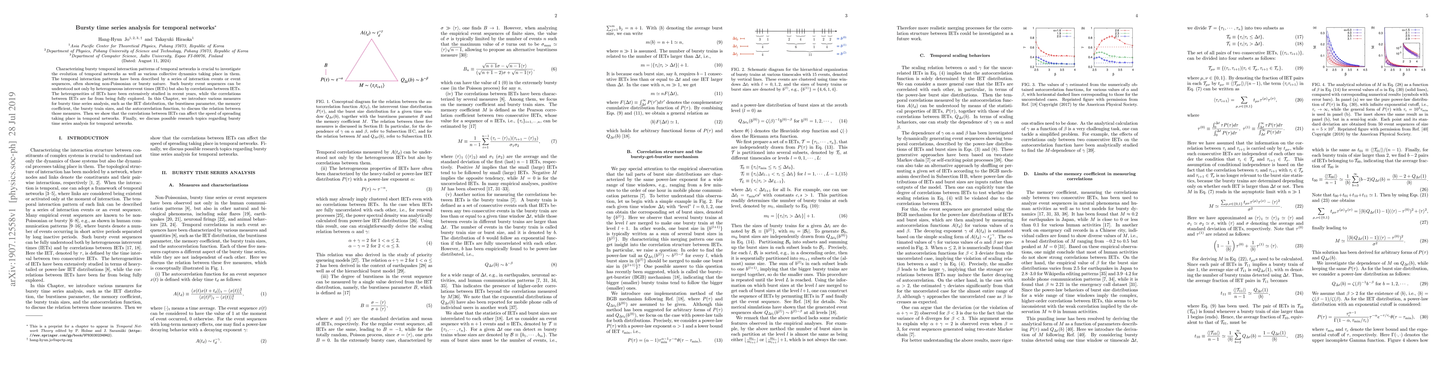 Characterizing bursty temporal interaction patterns of temporal networks is crucial to investigate the evolution of temporal networks as well as various collective dynamics taking place in them. The temporal interaction patterns have been described by a series of interaction events or event sequences, often showing non-Poissonian or bursty nature. Such bursty event sequences can be understood not only by heterogeneous interevent times (IETs) but also by correlations between IETs. The heterogeneities of IETs have been extensively studied in recent years, while the correlations between IETs are far from being fully explored. In this Chapter, we introduce various measures for bursty time series analysis, such as the IET distribution, the burstiness parameter, the memory coefficient, the bursty train sizes, and the autocorrelation function, to discuss the relation between those measures. Then we show that the correlations between IETs can affect the speed of spreading taking place in temporal networks. Finally, we discuss possible research topics regarding bursty time series analysis for temporal networks.