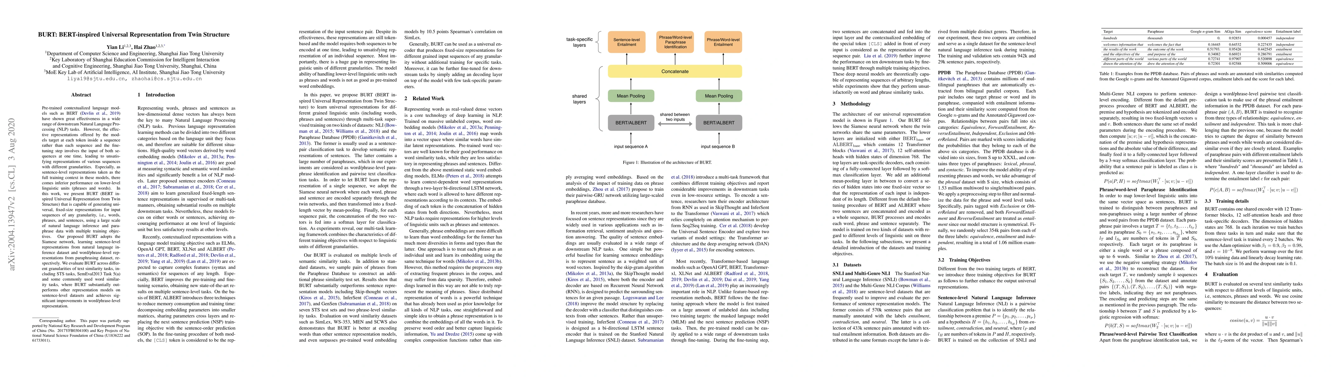 BURT (BERT-inspired Universal Representation from Twin Structure) aims to generate fixed-size representations for sequences of any granularity using a Siamese network trained on natural language inference and paraphrasing datasets. BURT outperforms other models in sentence-level tasks and shows significant improvements in word/phrase-level representation.