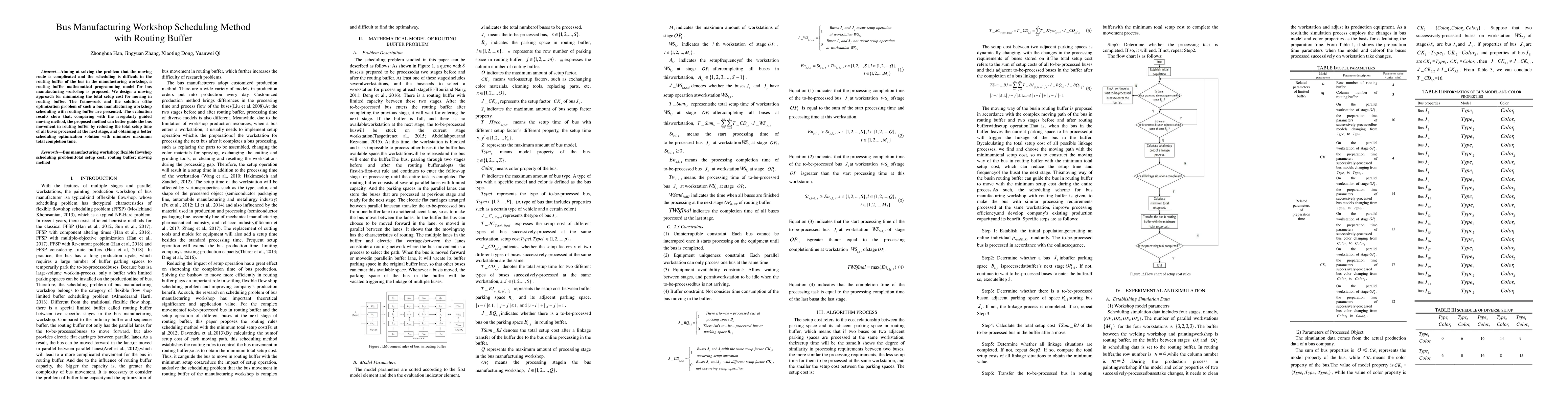 This paper proposes a mathematical programming model for optimizing bus manufacturing workshop scheduling with a routing buffer, aiming to minimize setup costs and total completion time. The new method effectively reduces setup time and achieves better scheduling optimization compared to irregular moving methods.