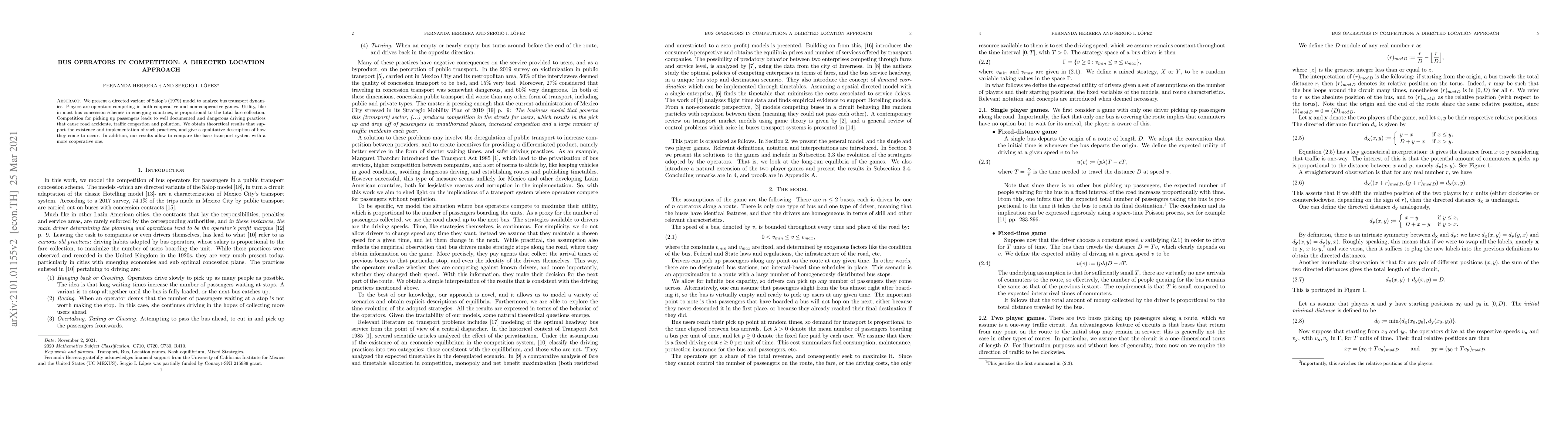 We present a directed variant of Salop (1979) model to analyze bus transport dynamics. The players are operators competing in cooperative and non-cooperative games. Utility, like in most bus concession schemes in emerging countries, is proportional to the total fare collection. Competition for picking up passengers leads to well documented and dangerous driving practices that cause road accidents, traffic congestion and pollution. We obtain theoretical results that support the existence and implementation of such practices, and give a qualitative description of how they come to occur. In addition, our results allow to compare the current or base transport system with a more cooperative one.