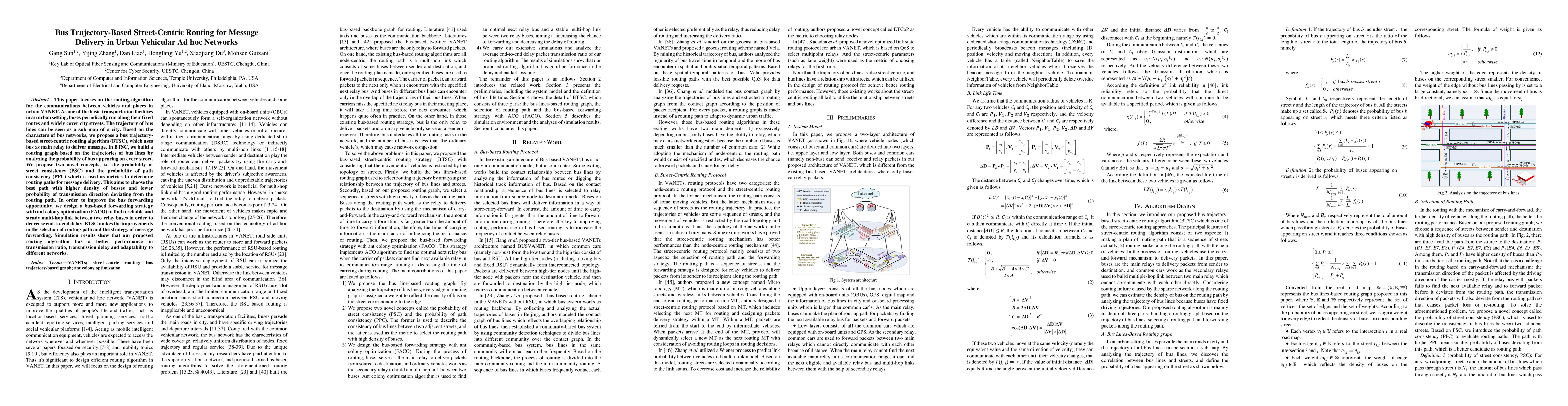 This paper proposes a bus trajectory-based street-centric routing algorithm (BTSC) for urban vehicular ad hoc networks, utilizing bus routes to enhance message delivery. BTSC employs probability metrics to select optimal routing paths and uses ant colony optimization for efficient bus-based forwarding to reduce delays.