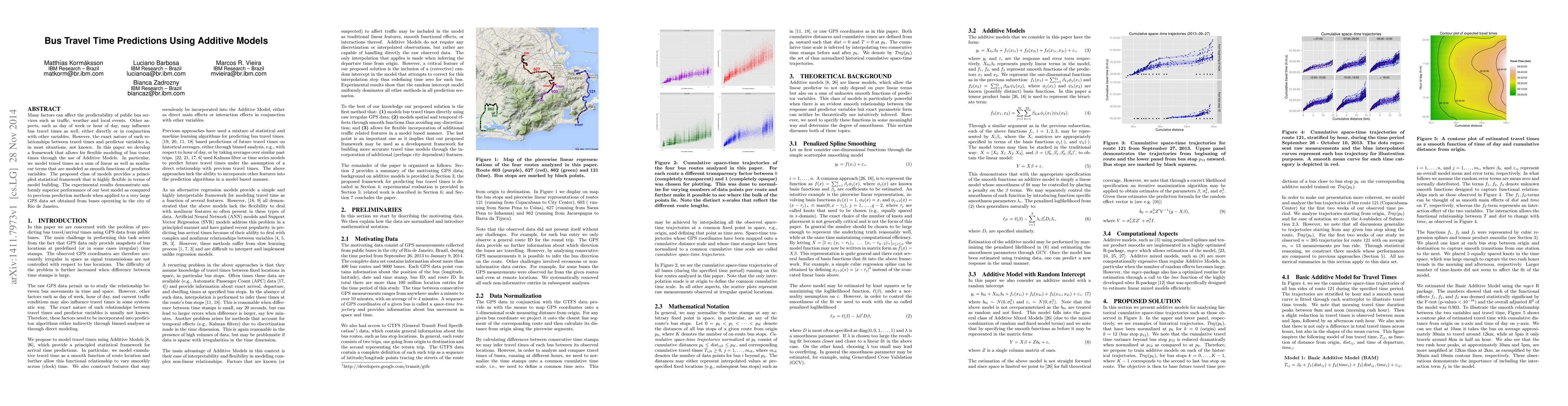 This paper introduces a flexible framework for predicting bus travel times using Additive Models, which combine linear and nonlinear terms modeled as smooth functions of various predictor variables like traffic, weather, day of week, and hour of day. Experimental results show that this method outperforms previous prediction methods when applied to a large GPS dataset from Rio de Janeiro buses.