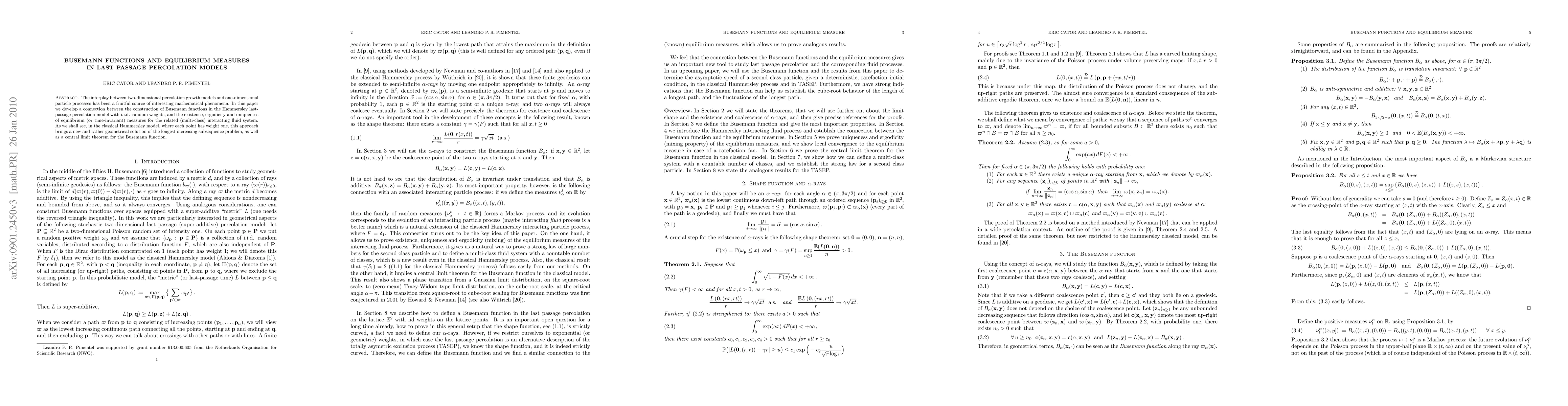The interplay between two-dimensional percolation growth models and one-dimensional particle processes has been a fruitful source of interesting mathematical phenomena. In this paper we develop a connection between the construction of Busemann functions in the Hammersley last-passage percolation model with i.i.d. random weights, and the existence, ergodicity and uniqueness of equilibrium (or time-invariant) measures for the related (multi-class) interacting fluid system. As we shall see, in the classical Hammersley model, where each point has weight one, this approach brings a new and rather geometrical solution of the longest increasing subsequence problem, as well as a central limit theorem for the Busemann function.
