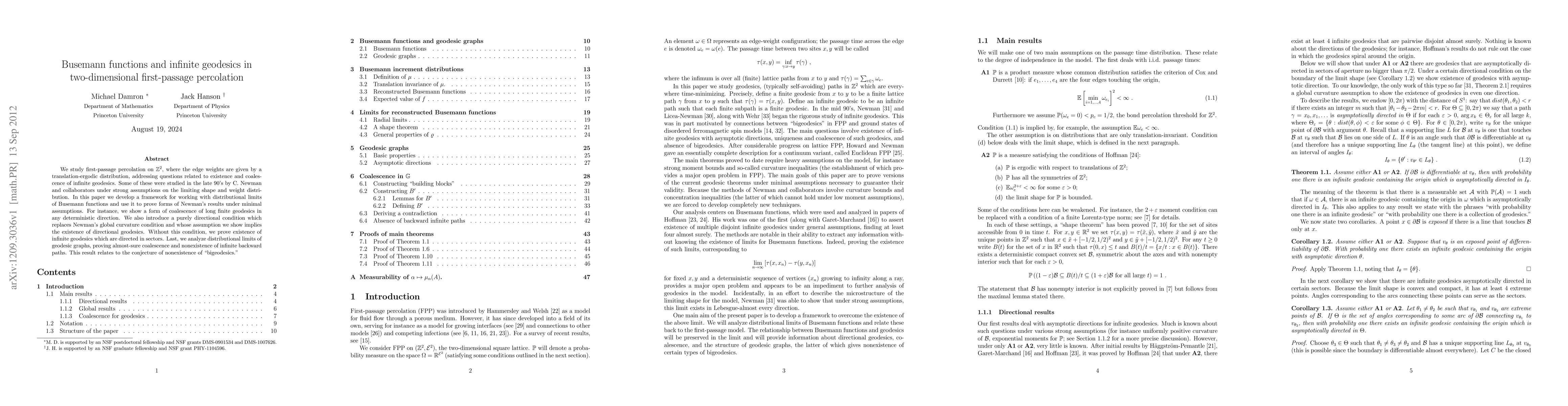 This paper develops a framework for first-passage percolation on Z2 with translation-ergodic edge weights, proving coalescence of infinite geodesics and existence of directional geodesics under minimal assumptions, replacing previous global curvature conditions. It also analyzes distributional limits of geodesic graphs, supporting the conjecture of nonexistence of "bigeodesics."