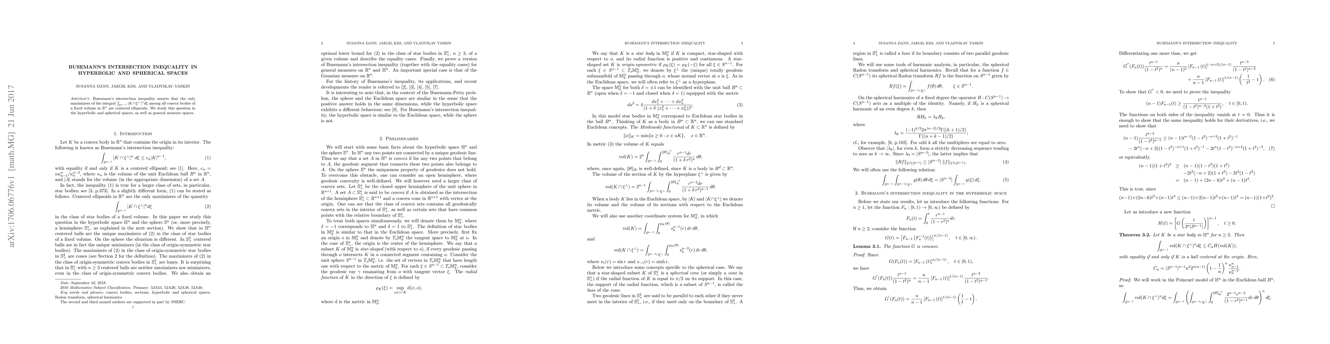 This paper explores Busemann's intersection inequality in hyperbolic and spherical spaces, examining whether centered ellipsoids are the unique maximizers of a specific integral among convex bodies of fixed volume, and extends this investigation to general measure spaces.