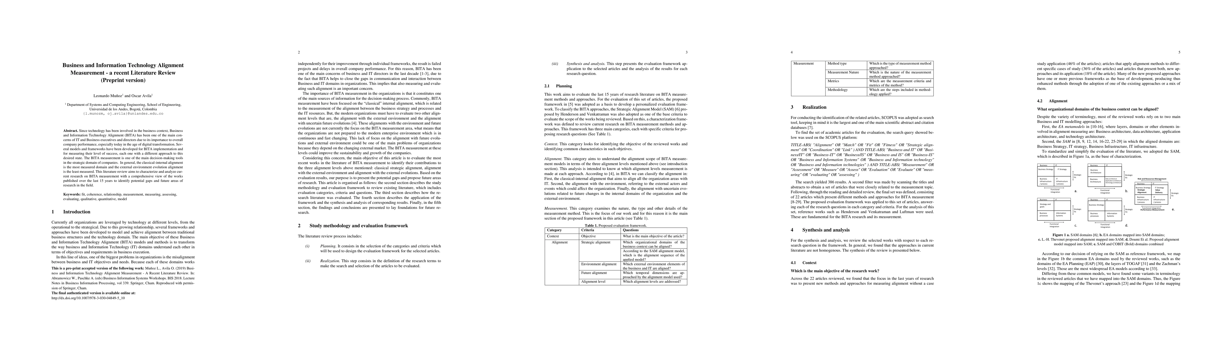 This literature review analyzes current research on Business and Information Technology Alignment (BITA) measurement over the last 15 years, identifying gaps and future areas of research to improve company performance during digital transformation. The study finds a disparity in the measurement of BITA between internal alignment and external environment evolution alignment.
