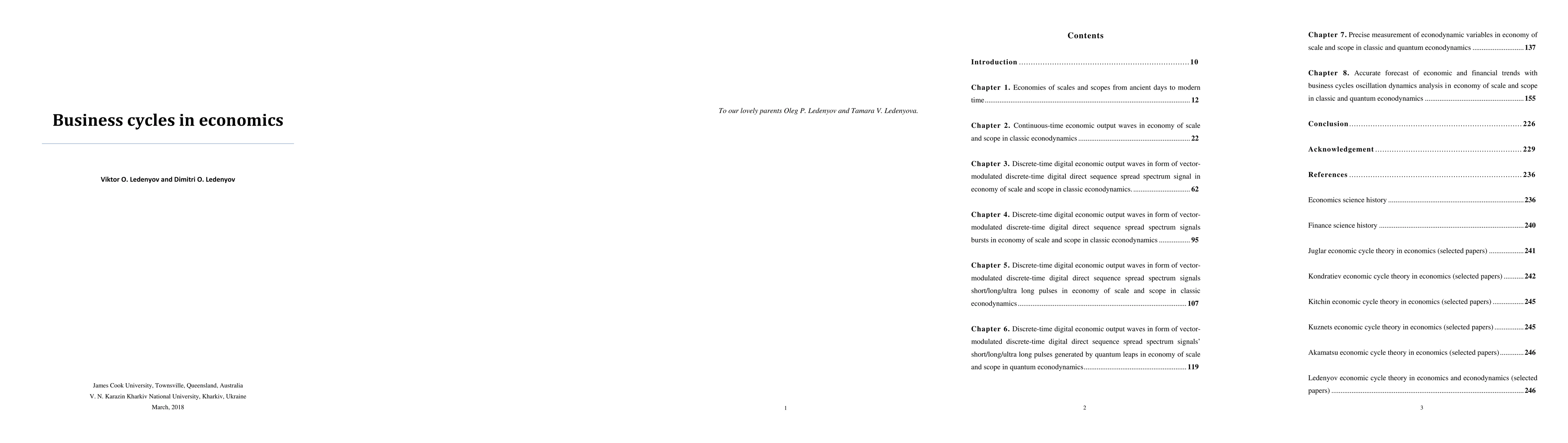 The business cycles are generated by the oscillating macro-/micro-/nano- economic output variables in the economy of the scale and the scope in the amplitude/frequency/phase/time domains in the economics. The accurate forward looking assumptions on the business cycles oscillation dynamics can optimize the financial capital investing and/or borrowing by the economic agents in the capital markets. The book's main objective is to study the business cycles in the economy of the scale and the scope, formulating the Ledenyov unified business cycles theory in the Ledenyov classic and quantum econodynamics.