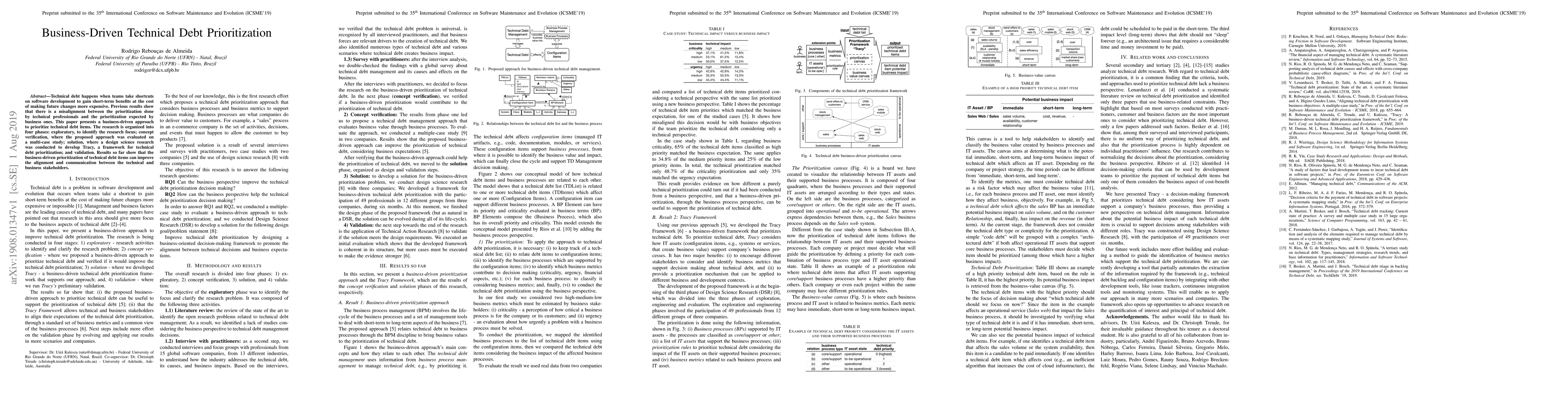 Technical debt happens when teams take shortcuts on software development to gain short-term benefits at the cost of making future changes more expensive. Previous results show that there is a misalignment between the prioritization done by technical professionals and the prioritization expected by business ones. This paper presents a business-driven approach to prioritize technical debt items. The research is organized into four phases: exploratory, to identify the research focus; concept verification, where the proposed approach was evaluated on a multi-case study; solution, where a design science research was conducted to develop Tracy, a framework for technical debt prioritization; and validation. Results so far show that the business-driven prioritization of technical debt items can improve the alignment and communication between the technical and business stakeholders.