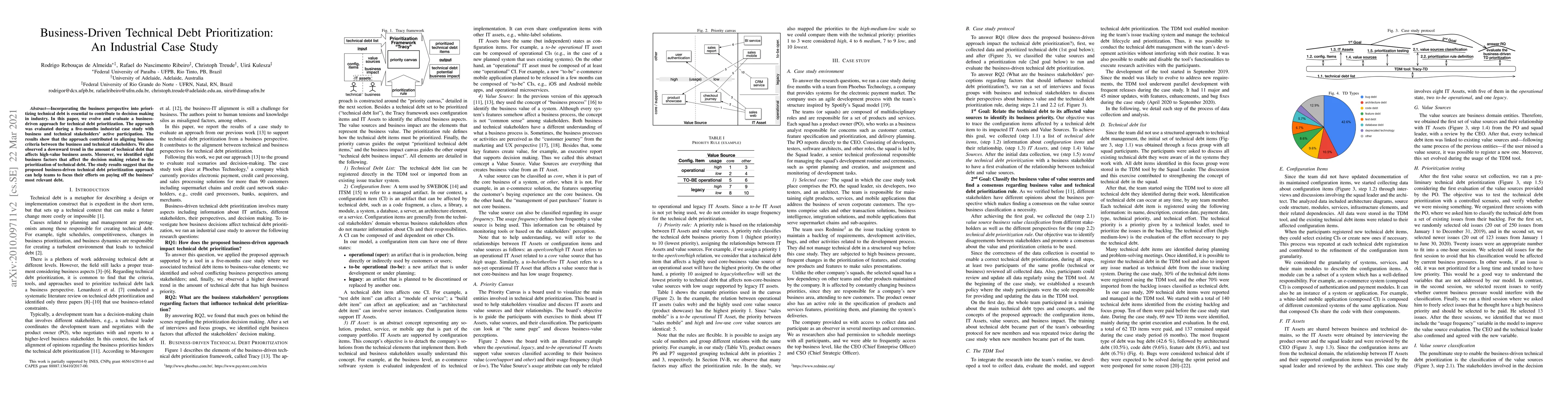 A business-driven approach to technical debt prioritization was evaluated through a 5-month industrial case study, showing alignment between business and technical stakeholders and a downward trend in high-value business assets' technical debt.