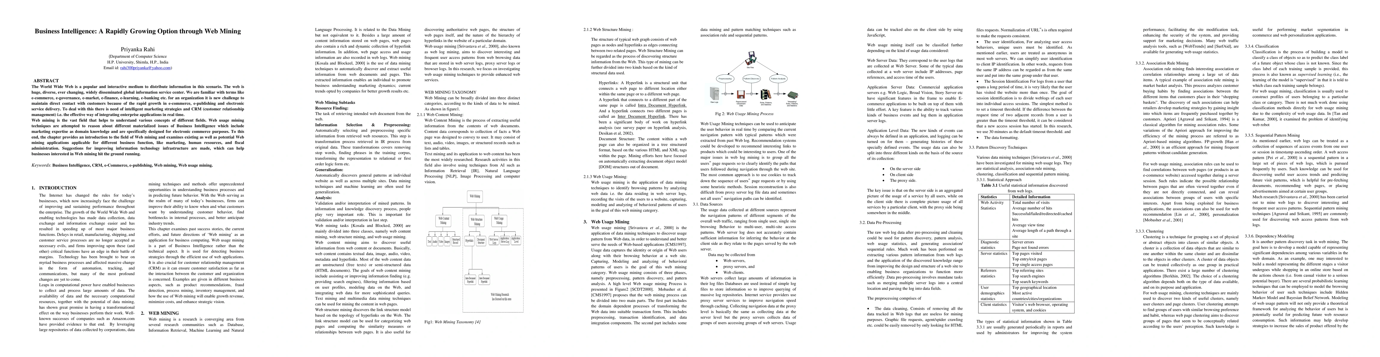 This paper explores the growing importance of web mining in business intelligence, emphasizing its role in enhancing customer relationship management and marketing strategies through the analysis of web usage data. It discusses various web mining applications across different business functions and suggests improvements to IT infrastructure to facilitate effective web mining initiatives.