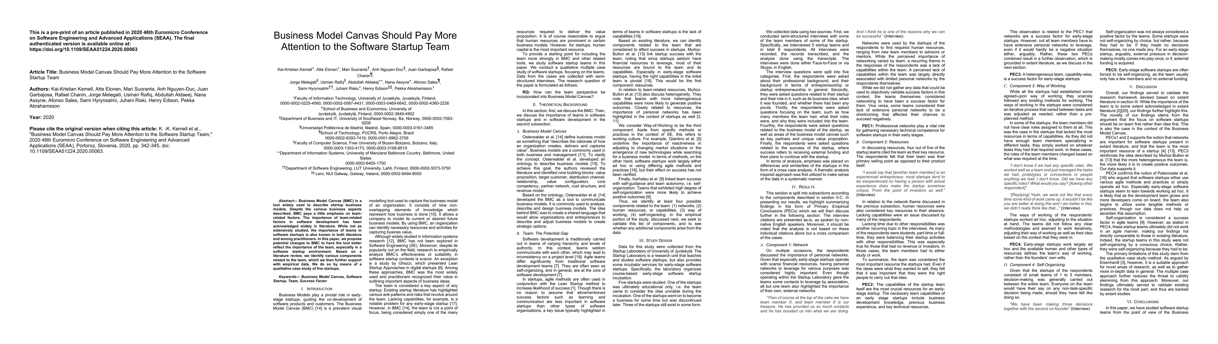 Business Model Canvas (BMC) is a tool widely used to describe startup business models. Despite the various business aspects described, BMC pays a little emphasis on team-related factors. The importance of team-related factors in software development has been acknowledged widely in literature. While not as extensively studied, the importance of teams in software startups is also known in both literature and among practitioners. In this paper, we propose potential changes to BMC to have the tool better reflect the importance of the team, especially in a software startup environment. Based on a literature review, we identify various components related to the team, which we then further support with empirical data. We do so by means of a qualitative case study of five startups.