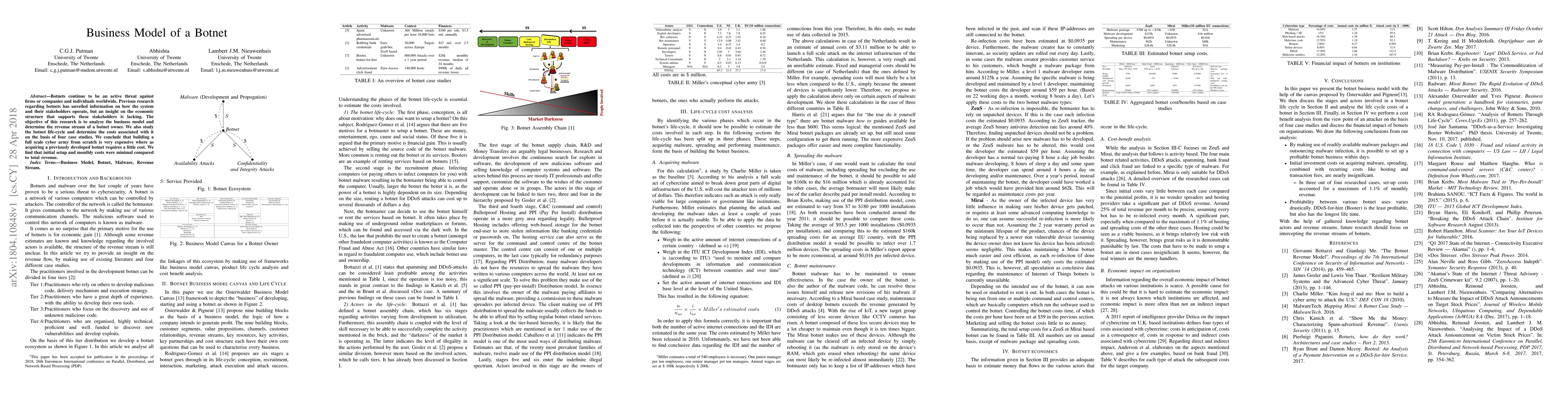 Botnets continue to be an active threat against firms or companies and individuals worldwide. Previous research regarding botnets has unveiled information on how the system and their stakeholders operate, but an insight on the economic structure that supports these stakeholders is lacking. The objective of this research is to analyse the business model and determine the revenue stream of a botnet owner. We also study the botnet life-cycle and determine the costs associated with it on the basis of four case studies. We conclude that building a full scale cyber army from scratch is very expensive where as acquiring a previously developed botnet requires a little cost. We find that initial setup and monthly costs were minimal compared to total revenue.