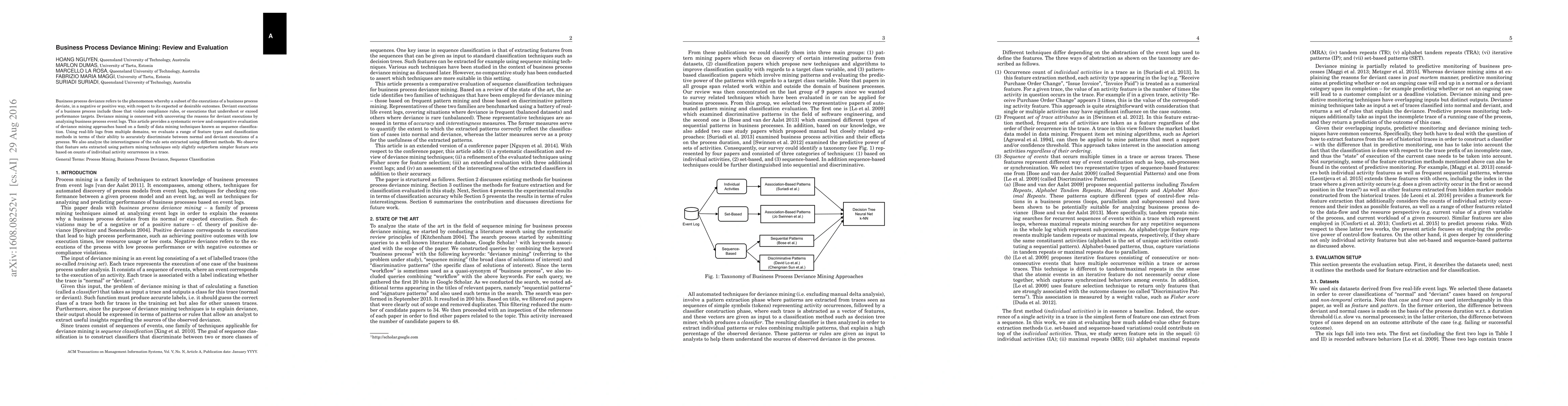 This paper reviews and evaluates deviance mining techniques for uncovering reasons behind deviant business process executions. It compares various feature types and classification methods using real-life logs, finding that pattern mining techniques offer only marginal improvements over simpler feature sets.