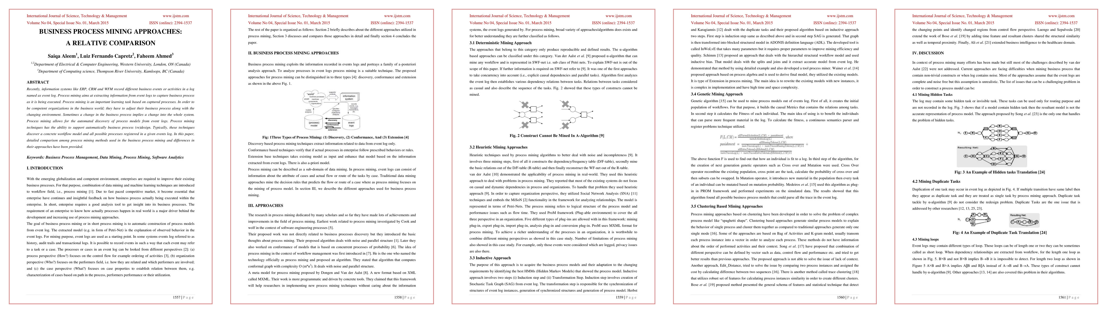This paper provides a detailed comparison of various process mining methods used in business process mining, highlighting their differences and how they support the automated discovery and redesign of business processes from event logs. The focus is on how these techniques can help organizations adapt to changing environments.