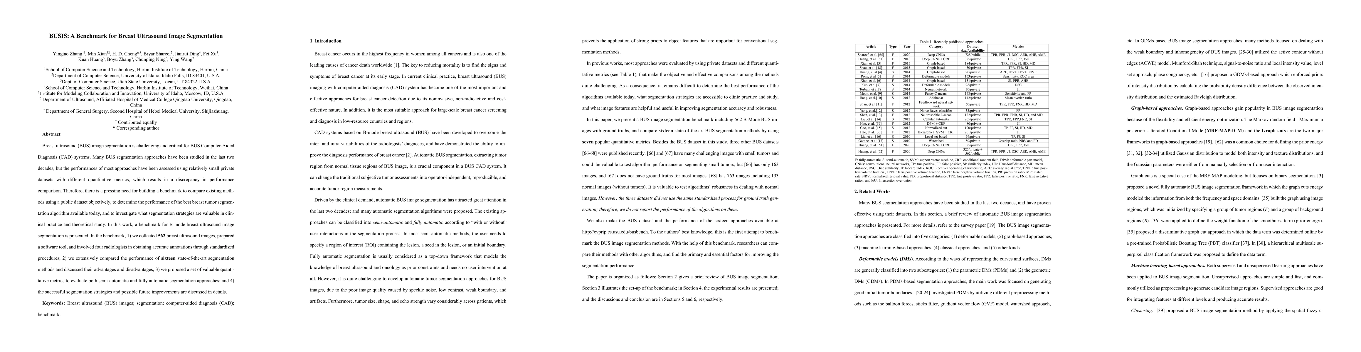 The paper introduces BUSIS, a benchmark for breast ultrasound image segmentation, featuring 562 images and annotations by radiologists. It compares 16 state-of-the-art segmentation methods and proposes quantitative metrics for evaluation, aiming to objectively assess the best available algorithms and identify valuable segmentation strategies for clinical and theoretical research.