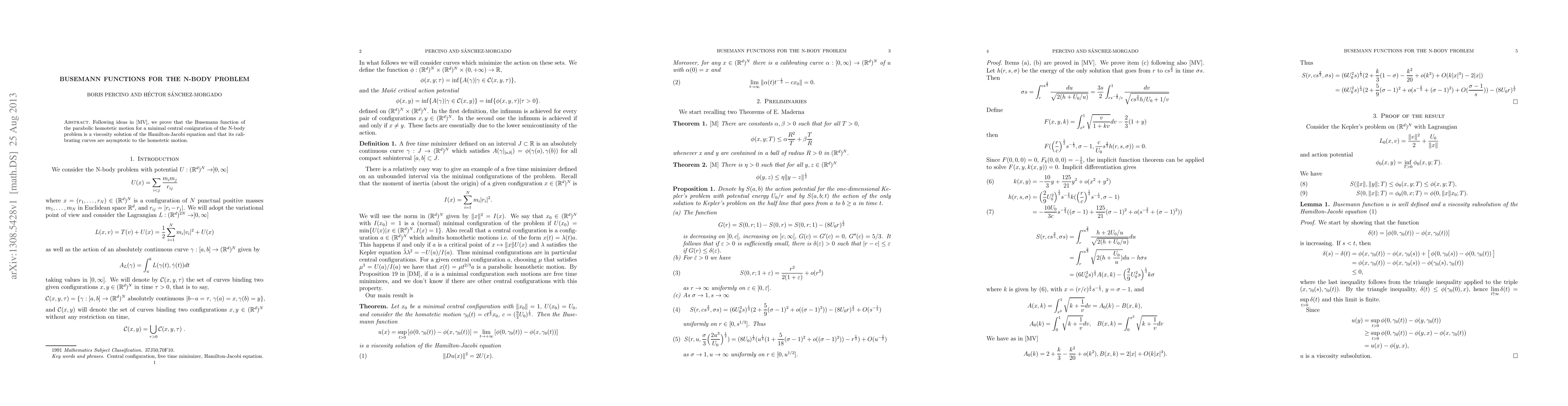 We prove that the Busemann function of the parabolic homotetic motion for a minimal central coniguration of the N-body problem is a viscosity solution of the Hamilton-Jacobi equation and that its calibrating curves are asymptotic to the homotetic motion.