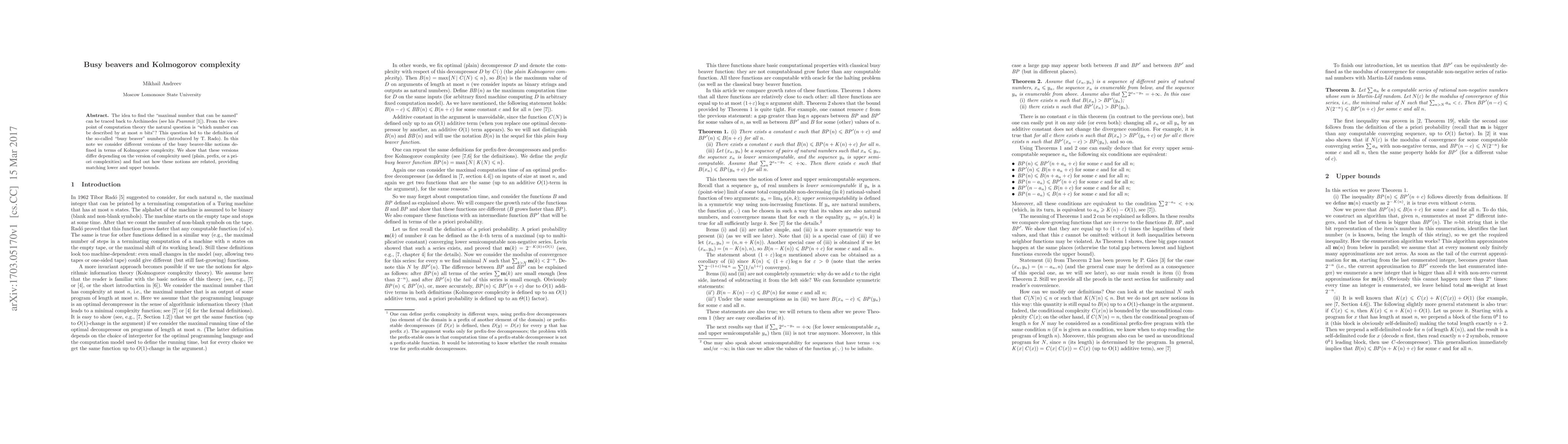 The idea to find the "maximal number that can be named" can be traced back to Archimedes (see his Psammit). From the viewpoint of computation theory the natural question is "which number can be described by at most n bits"? This question led to the definition of the so-called "busy beaver" numbers (introduced by T. Rado). In this note we consider different versions of the busy beaver-like notions defined in terms of Kolmogorov complexity. We show that these versions differ depending on the version of complexity used (plain, prefix, or a priori complexities) and find out how these notions are related, providing matching lower and upper bounds.