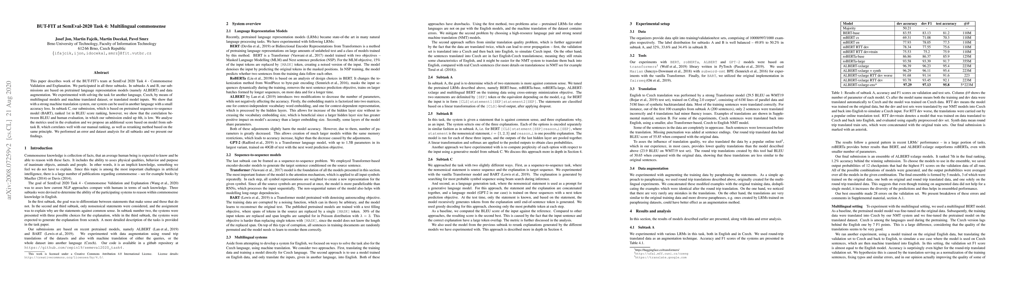 This paper describes work of the BUT-FIT's team at SemEval 2020 Task 4 - Commonsense Validation and Explanation. We participated in all three subtasks. In subtasks A and B, our submissions are based on pretrained language representation models (namely ALBERT) and data augmentation. We experimented with solving the task for another language, Czech, by means of multilingual models and machine translated dataset, or translated model inputs. We show that with a strong machine translation system, our system can be used in another language with a small accuracy loss. In subtask C, our submission, which is based on pretrained sequence-to-sequence model (BART), ranked 1st in BLEU score ranking, however, we show that the correlation between BLEU and human evaluation, in which our submission ended up 4th, is low. We analyse the metrics used in the evaluation and we propose an additional score based on model from subtask B, which correlates well with our manual ranking, as well as reranking method based on the same principle. We performed an error and dataset analysis for all subtasks and we present our findings.