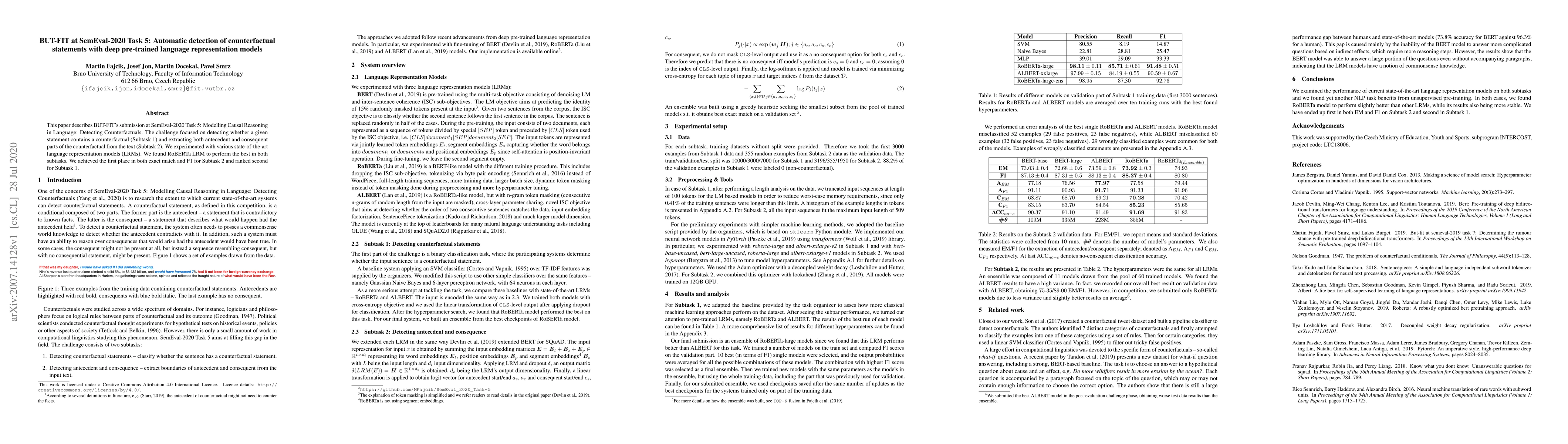 BUT-FIT's submission at SemEval-2020 Task 5 utilized deep pre-trained language representation models to detect counterfactual statements and extract their parts. RoBERTa performed best, securing first place in Subtask 2 and second in Subtask 1.