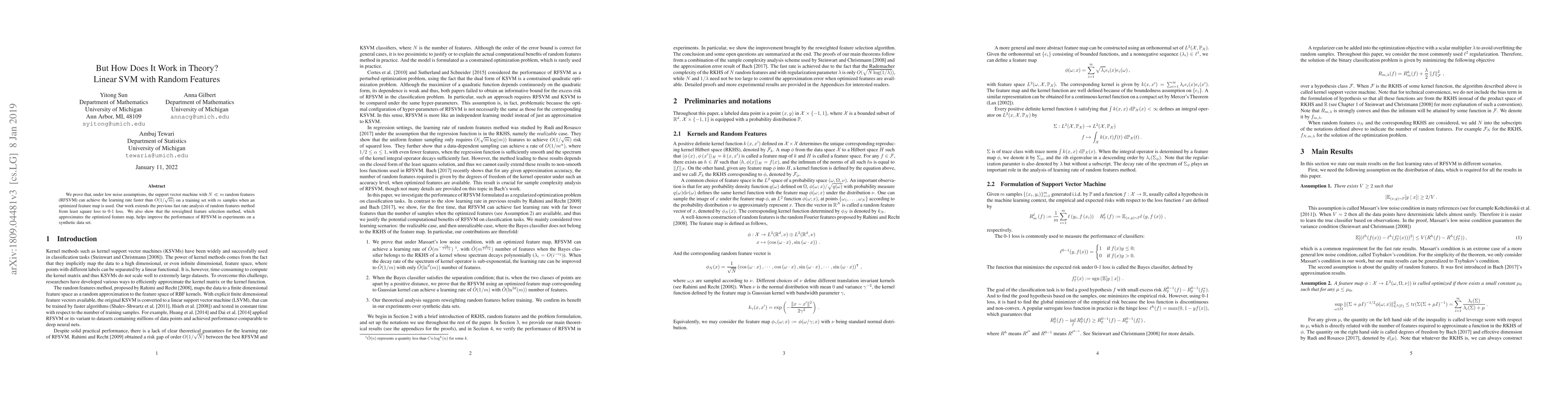 This paper demonstrates that a linear SVM with a small number of random features can achieve faster learning rates than $O(1/\sqrt{m})$ under low noise conditions, extending the analysis from least squares to 0-1 loss. Additionally, it shows that a reweighted feature selection method approximates the optimized feature map and enhances RFSVM performance in experiments.