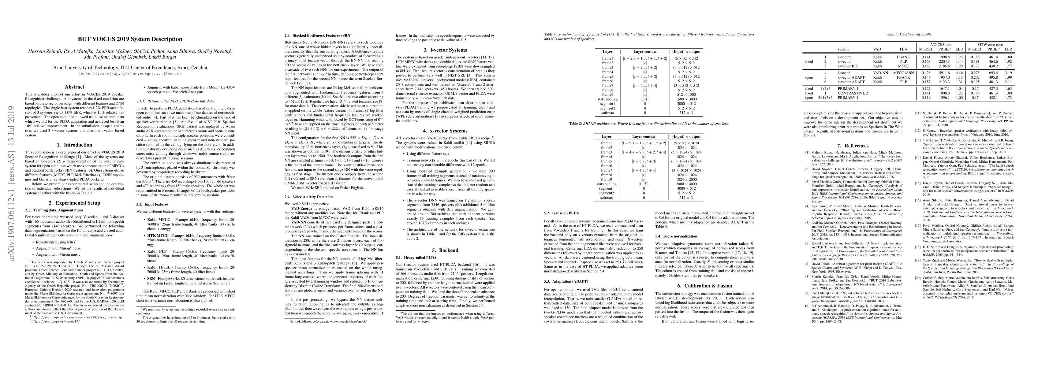 This is a description of our effort in VOiCES 2019 Speaker Recognition challenge. All systems in the fixed condition are based on the x-vector paradigm with different features and DNN topologies. The single best system reaches 1.2% EER and a fusion of 3 systems yields 1.0% EER, which is 15% relative improvement. The open condition allowed us to use external data which we did for the PLDA adaptation and achieved less than ~10% relative improvement. In the submission to open condition, we used 3 x-vector systems and also one i-vector based system.