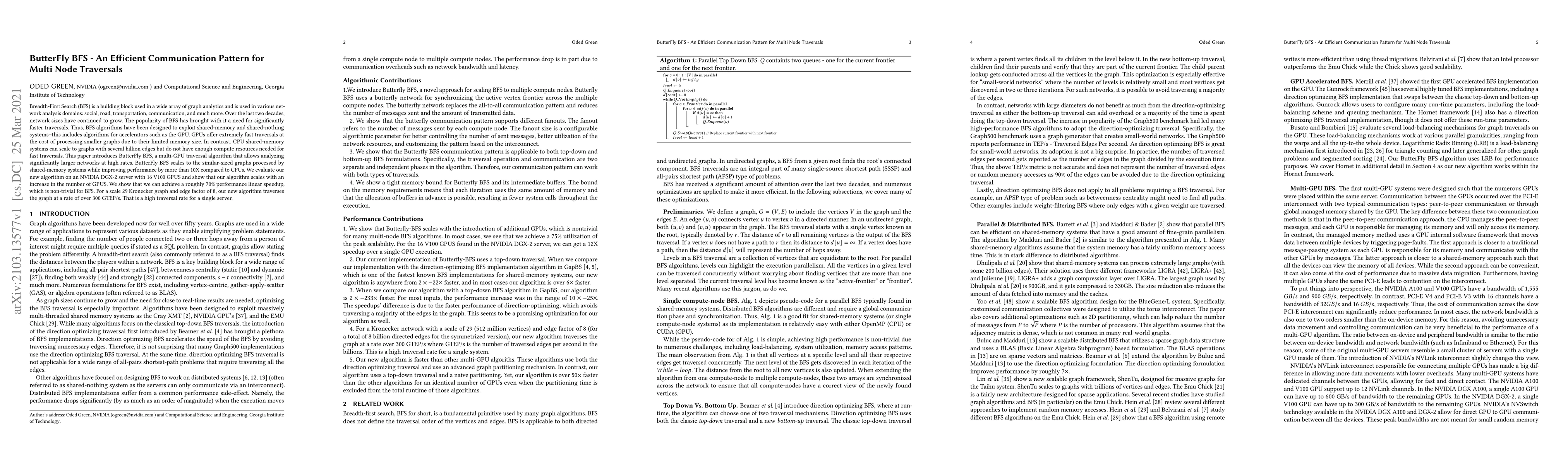 Breadth-First Search (BFS) is a building block used in a wide array of graph analytics and is used in various network analysis domains: social, road, transportation, communication, and much more. Over the last two decades, network sizes have continued to grow. The popularity of BFS has brought with it a need for significantly faster traversals. Thus, BFS algorithms have been designed to exploit shared-memory and shared-nothing systems -- this includes algorithms for accelerators such as the GPU. GPUs offer extremely fast traversals at the cost of processing smaller graphs due to their limited memory size. In contrast, CPU shared-memory systems can scale to graphs with several billion edges but do not have enough compute resources needed for fast traversals. This paper introduces ButterFly BFS, a multi-GPU traversal algorithm that allows analyzing significantly larger networks at high rates. ButterFly BFS scales to the similar-sized graphs processed by shared-memory systems while improving performance by more than 10X compared to CPUs. We evaluate our new algorithm on an NVIDIA DGX-2 server with 16 V100 GPUS and show that our algorithm scales with an increase in the number of GPUS. We show that we can achieve a roughly $70\%$ performance linear speedup, which is non-trivial for BFS. For a scale 29 Kronecker graph and edge factor of 8, our new algorithm traverses the graph at a rate of over 300 GTEP/s. That is a high traversal rate for a single server.
