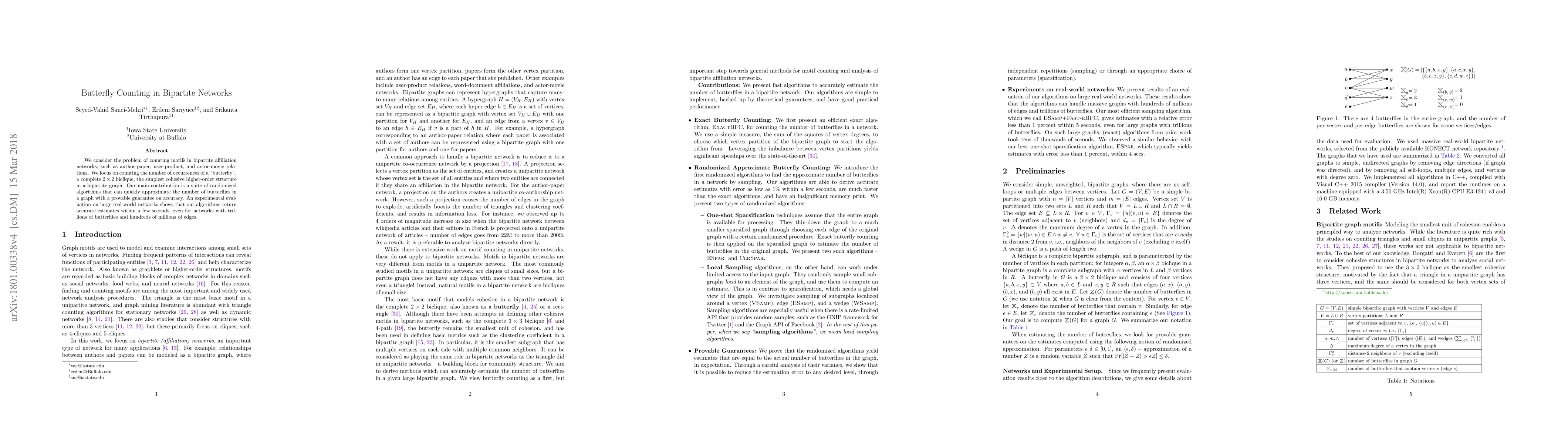 This paper presents randomized algorithms for quickly approximating the number of butterfly motifs in large bipartite networks, such as author-paper relations, demonstrating their effectiveness with real-world datasets and showing accurate estimates within seconds. The algorithms provide provable accuracy guarantees and handle networks with vast numbers of edges and motifs efficiently.