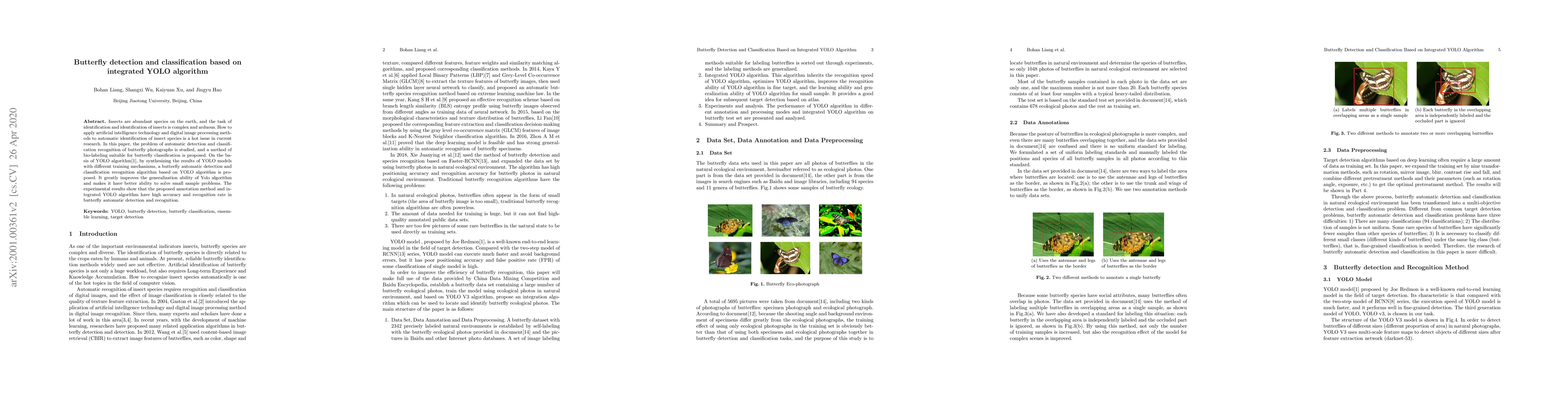 Insects are abundant species on the earth, and the task of identification and identification of insects is complex and arduous. How to apply artificial intelligence technology and digital image processing methods to automatic identification of insect species is a hot issue in current research. In this paper, the problem of automatic detection and classification recognition of butterfly photographs is studied, and a method of bio-labeling suitable for butterfly classification is proposed. On the basis of YOLO algorithm, by synthesizing the results of YOLO models with different training mechanisms, a butterfly automatic detection and classification recognition algorithm based on YOLO algorithm is proposed. It greatly improves the generalization ability of YOLO algorithm and makes it have better ability to solve small sample problems. The experimental results show that the proposed annotation method and integrated YOLO algorithm have high accuracy and recognition rate in butterfly automatic detection and recognition.