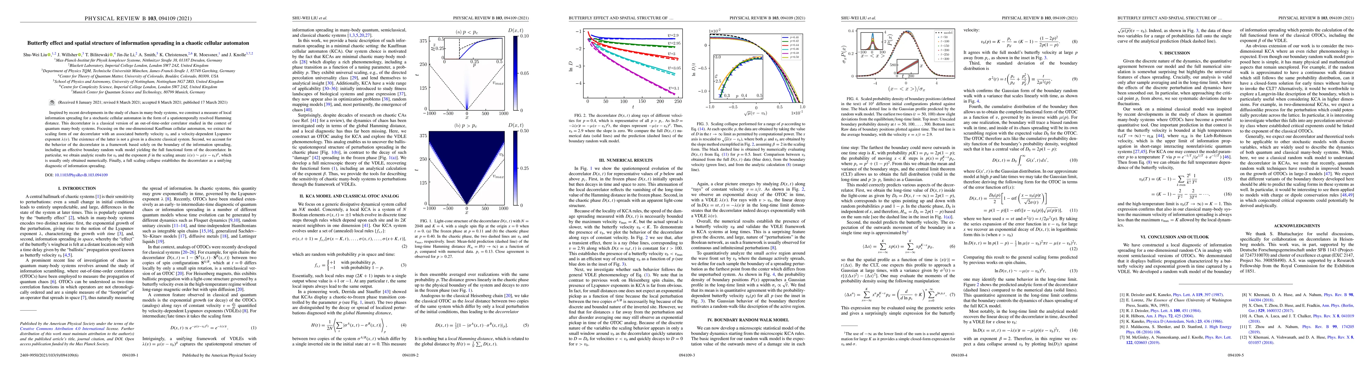 Inspired by recent developments in the study of chaos in many-body systems, we construct a measure of local information spreading for a stochastic Cellular Automaton in the form of a spatiotemporally resolved Hamming distance. This decorrelator is a classical version of an Out-of-Time-Order Correlator studied in the context of quantum many-body systems. Focusing on the one-dimensional Kauffman Cellular Automaton, we extract the scaling form of our decorrelator with an associated butterfly velocity $v_b$ and a velocity-dependent Lyapunov exponent $\lambda(v)$. The existence of the latter is not a given in a discrete classical system. Second, we account for the behaviour of the decorrelator in a framework based solely on the boundary of the information spreading, including an effective boundary random walk model yielding the full functional form of the decorrelator. In particular, we obtain analytic results for $v_b$ and the exponent $\beta$ in the scaling ansatz $\lambda(v) \sim \mu (v - v_b)^\beta$, which is usually only obtained numerically. Finally, a full scaling collapse establishes the decorrelator as a unifying diagnostic of information spreading.