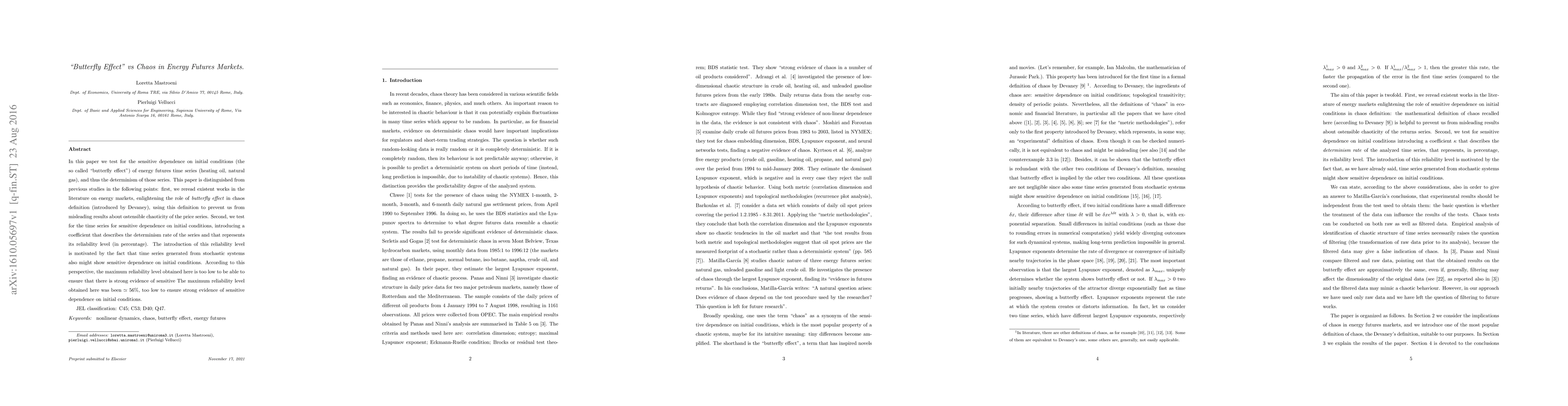 This paper examines the 'butterfly effect' in energy futures markets, finding a maximum reliability level of approximately 56%, insufficient to confirm sensitive dependence on initial conditions. It distinguishes itself by re-evaluating existing literature and introducing a determinism rate coefficient to measure reliability.