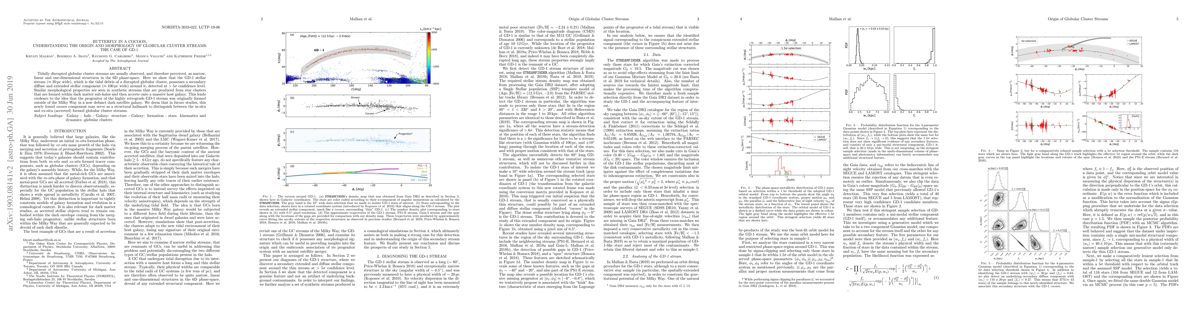 This paper reveals that the GD-1 stellar stream, a tidal remnant of a globular cluster, has a secondary extended component, suggesting its origin from a disrupted satellite galaxy outside the Milky Way. The discovery of this "cocoon" component may help differentiate between in-situ and accreted globular cluster streams.