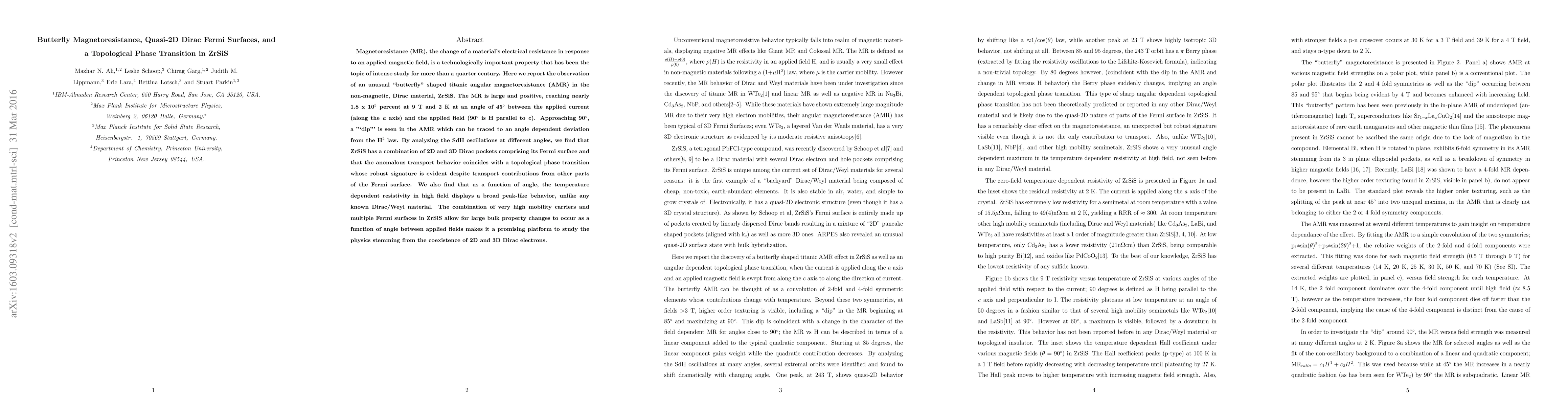 This paper reports the observation of a "butterfly" shaped magnetoresistance in ZrSiS, a Dirac material, revealing a topological phase transition linked to its quasi-2D Dirac Fermi surfaces. The study highlights the material's potential for exploring the physics of 2D and 3D Dirac electrons due to its high mobility carriers and complex Fermi surface.
