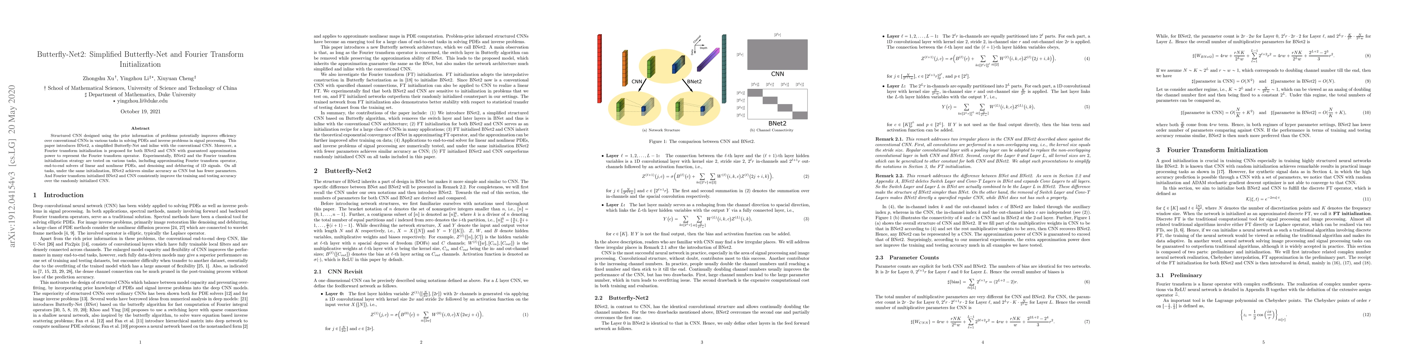 Butterfly-Net2 (BNet2) simplifies the Butterfly-Net architecture while maintaining comparable accuracy to conventional CNNs with fewer parameters. A Fourier transform initialization strategy is proposed to enhance both BNet2 and CNNs, consistently improving their performance across tasks like PDE solving, signal denoising, and deblurring.