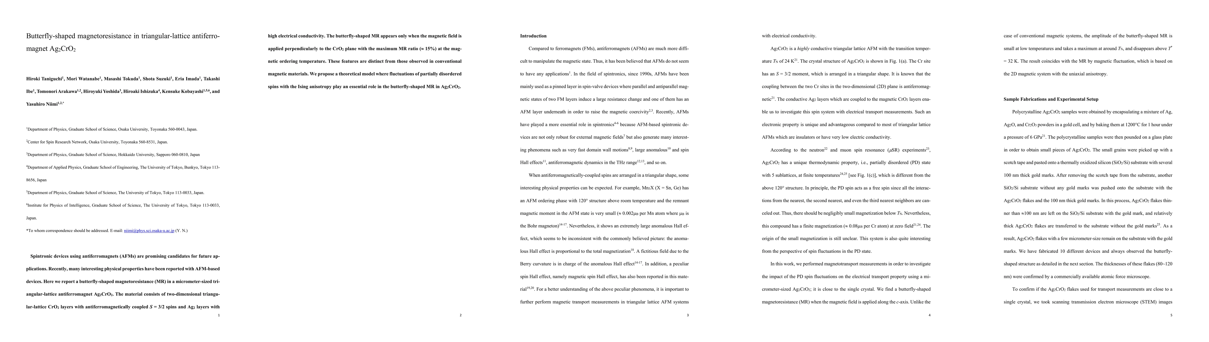 Spintronic devices using antiferromagnets (AFMs) are promising candidates for future applications. Recently, many interesting physical properties have been reported with AFM-based devices. Here we report a butterfly-shaped magnetoresistance (MR) in a micrometer-sized triangular-lattice antiferromagnet Ag$_2$CrO$_2$. The material consists of two-dimensional triangular-lattice CrO$_2$ layers with antiferromagnetically coupled $S$ = 3/2 spins and Ag$_2$ layers with high electrical conductivity. The butterfly-shaped MR appears only when the magnetic field is applied perpendicularly to the CrO$_2$ plane with the maximum MR ratio ($\approx$ 15%) at the magnetic ordering temperature. These features are distinct from those observed in conventional magnetic materials. We propose a theoretical model where fluctuations of partially disordered spins with the Ising anisotropy play an essential role in the butterfly-shaped MR in Ag$_2$CrO$_2$.