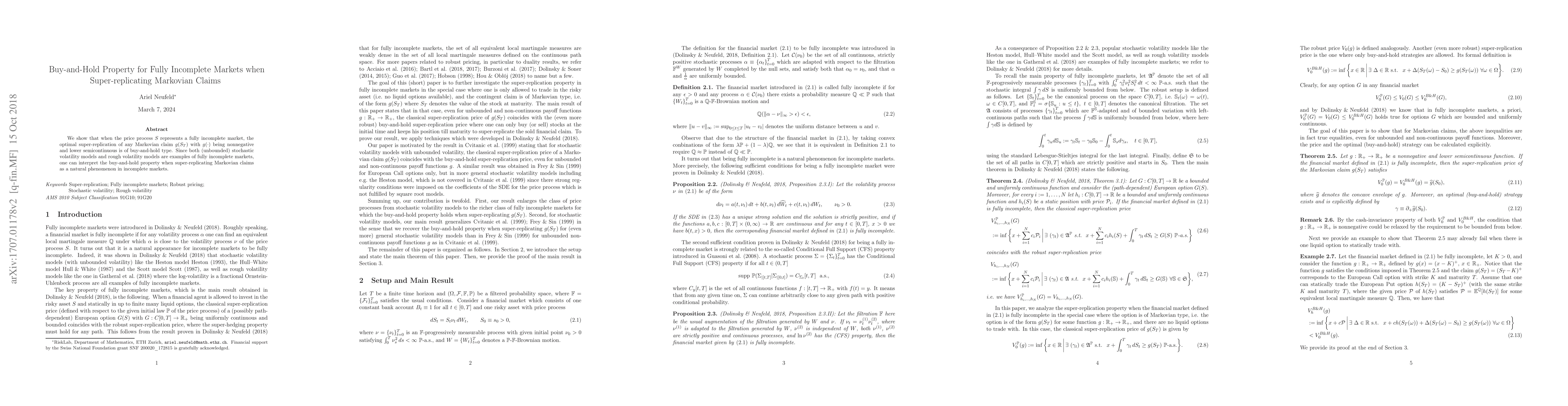 This paper demonstrates that in fully incomplete markets, the optimal strategy for super-replicating Markovian claims is a buy-and-hold approach. This finding holds for models with stochastic or rough volatility, highlighting a natural property in such markets.