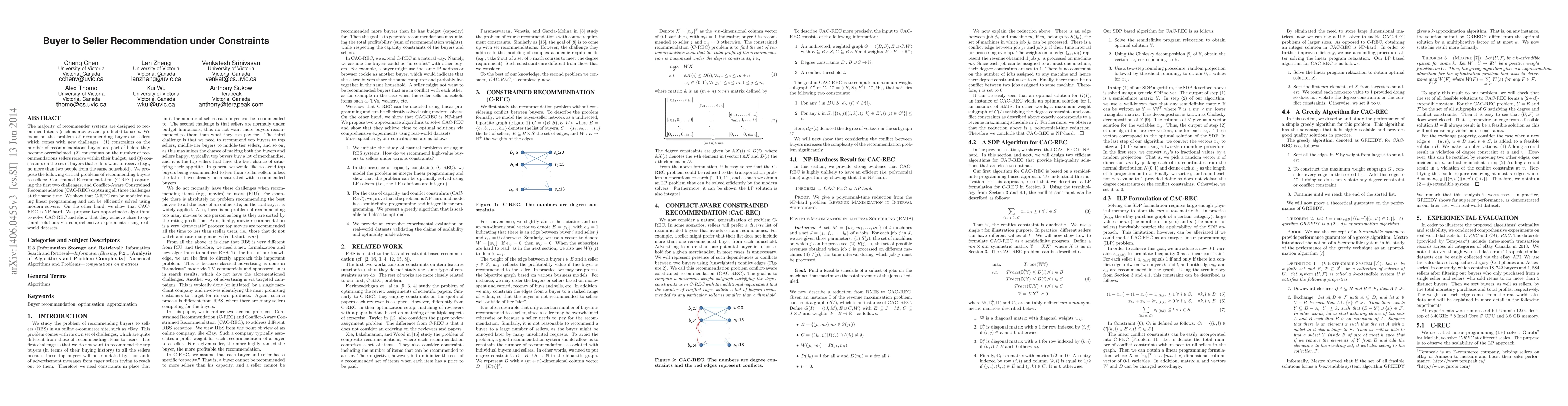 The majority of recommender systems are designed to recommend items (such as movies and products) to users. We focus on the problem of recommending buyers to sellers which comes with new challenges: (1) constraints on the number of recommendations buyers are part of before they become overwhelmed, (2) constraints on the number of recommendations sellers receive within their budget, and (3) constraints on the set of buyers that sellers want to receive (e.g., no more than two people from the same household). We propose the following critical problems of recommending buyers to sellers: Constrained Recommendation (C-REC) capturing the first two challenges, and Conflict-Aware Constrained Recommendation (CAC-REC) capturing all three challenges at the same time. We show that C-REC can be modeled using linear programming and can be efficiently solved using modern solvers. On the other hand, we show that CAC-REC is NP-hard. We propose two approximate algorithms to solve CAC-REC and show that they achieve close to optimal solutions via comprehensive experiments using real-world datasets.