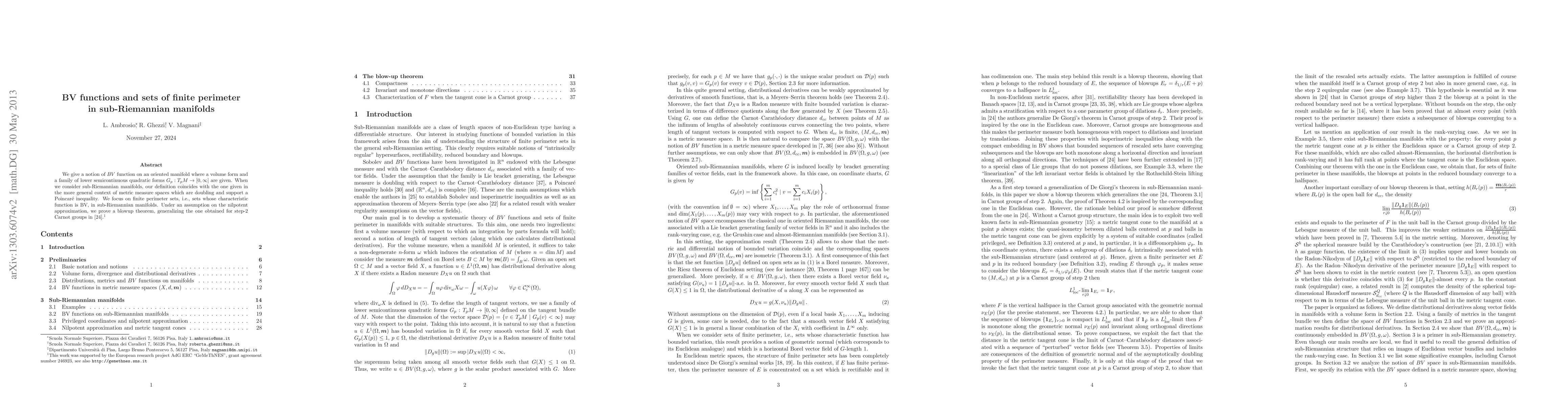 This paper introduces BV functions on oriented manifolds with a volume form and quadratic forms, aligning with metric measure spaces in sub-Riemannian settings. It studies finite perimeter sets in these manifolds and proves a blowup theorem under nilpotent approximation assumptions, extending results from step-2 Carnot groups.