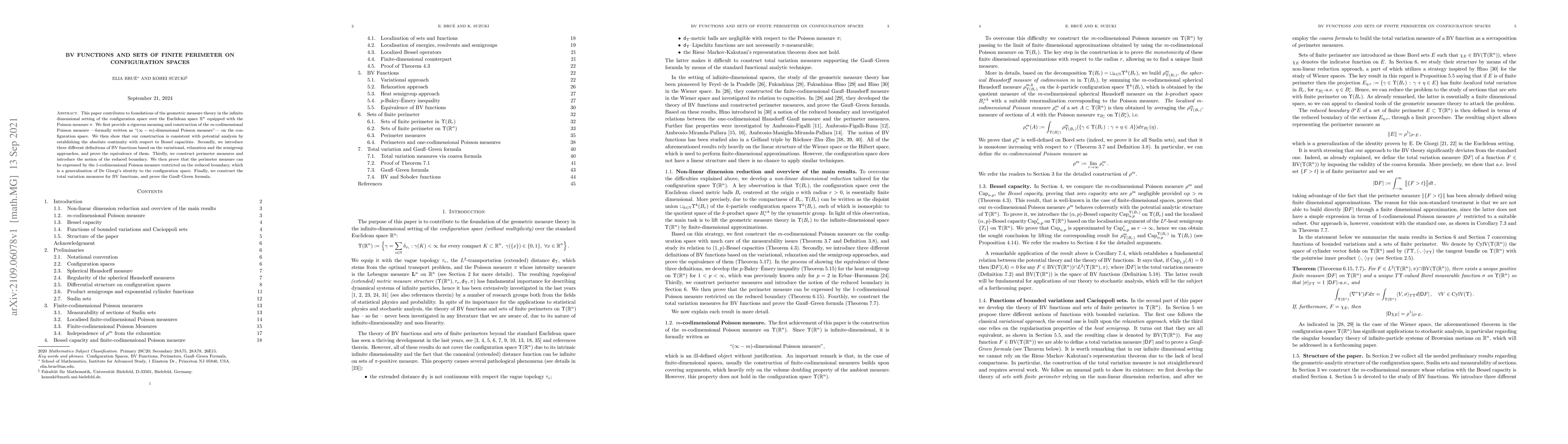 This paper contributes to foundations of the geometric measure theory in the infinite dimensional setting of the configuration space over the Euclidean space $\mathbb R^n$ equipped with the Poisson measure $\pi$. We first provide a rigorous meaning and construction of the $m$-codimensional Poisson measure -- formally written as "$(\infty-m)$-dimensional Poisson measure" -- on the configuration space. We then show that our construction is consistent with potential analysis by establishing the absolute continuity with respect to Bessel capacities. Secondly, we introduce three different definitions of BV functions based on the variational, relaxation and the semigroup approaches, and prove the equivalence of them. Thirdly, we construct perimeter measures and introduce the notion of the reduced boundary. We then prove that the perimeter measure can be expressed by the $1$-codimensional Poisson measure restricted on the reduced boundary, which is a generalisation of De Giorgi's identity to the configuration space. Finally, we construct the total variation measures for BV functions, and prove the Gau{\ss}--Green formula.