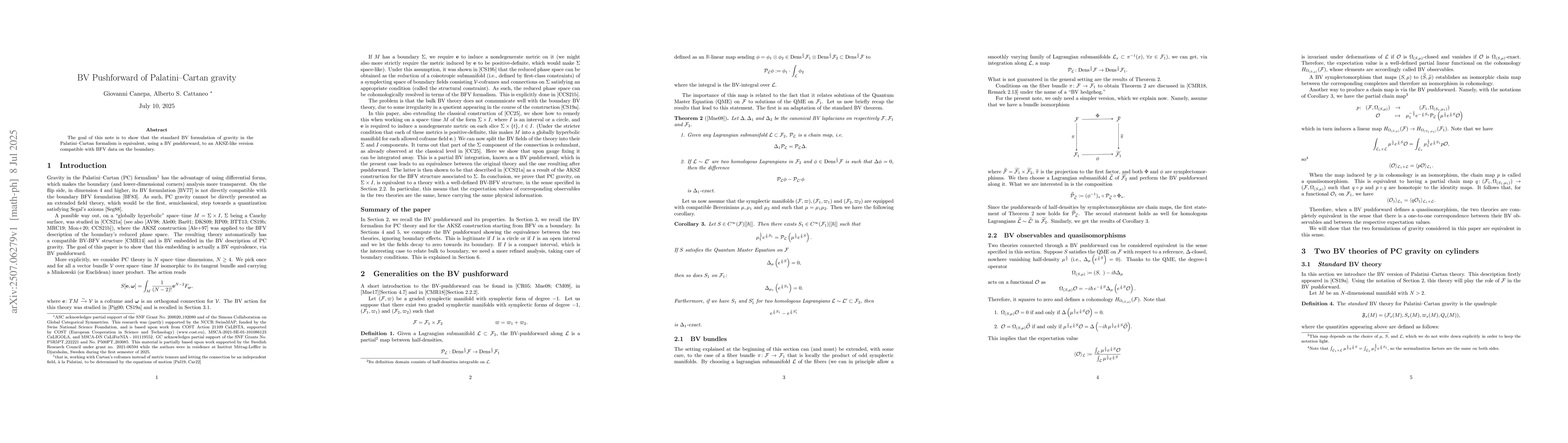 The goal of this note is to show that the standard BV formulation of gravity in the Palatini-Cartan formalism is equivalent, using a BV pushforward, to an AKSZ-like version compatible with BFV data on the boundary.